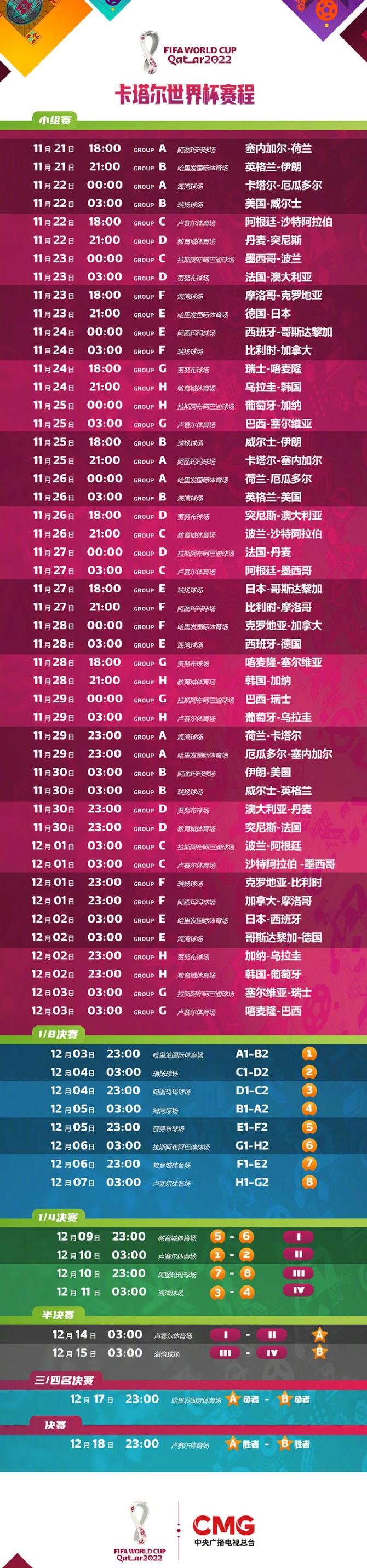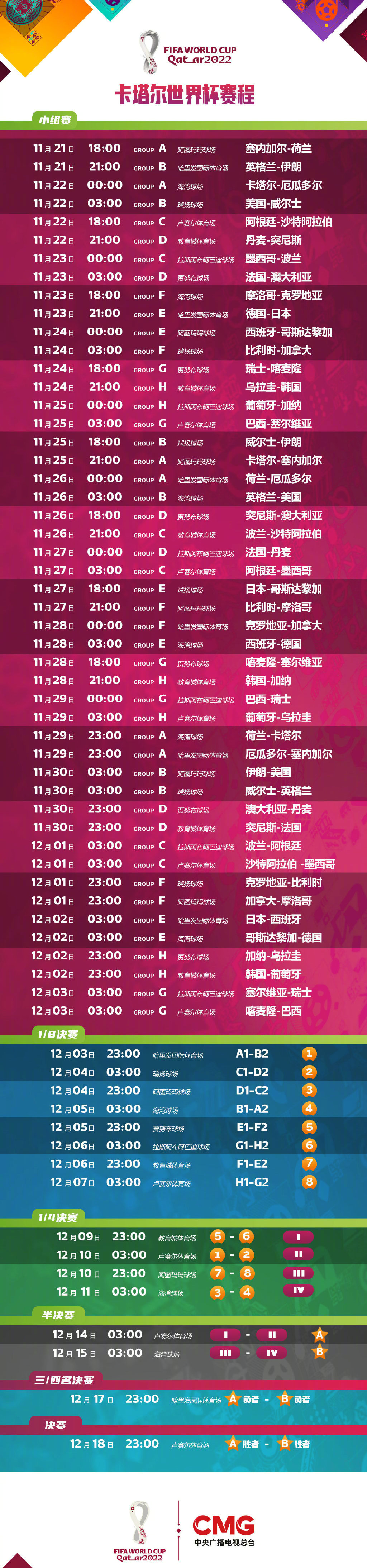 8个小组的角逐将在12天的时间内完成,小组赛阶段每天4场比赛。从开球时间来看,小组赛阶段的比赛被安排在北京时间18点、21点、24点以及凌晨3点开球,中国球迷不用熬夜就可以观看大部分比赛。但最后一轮小组赛及淘汰赛阶段,分别定于北京时间23点、3点开球,决赛定于北京时间12月18日晚23点,这些更加紧张刺激的比赛,中国球迷还是要在夜晚熬一熬。