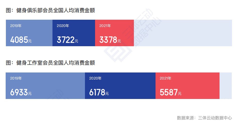 会员人均消费方面,2021年,健身会员在健身房的人均年度消费支出显著降低,健身俱乐部会员全国均值3378元,比去年下降了9.24%,比2019年下降了17.31%;健身工作室会员全国均值5587元,比去年下降了9.69%,比2019年下降了19.41%。