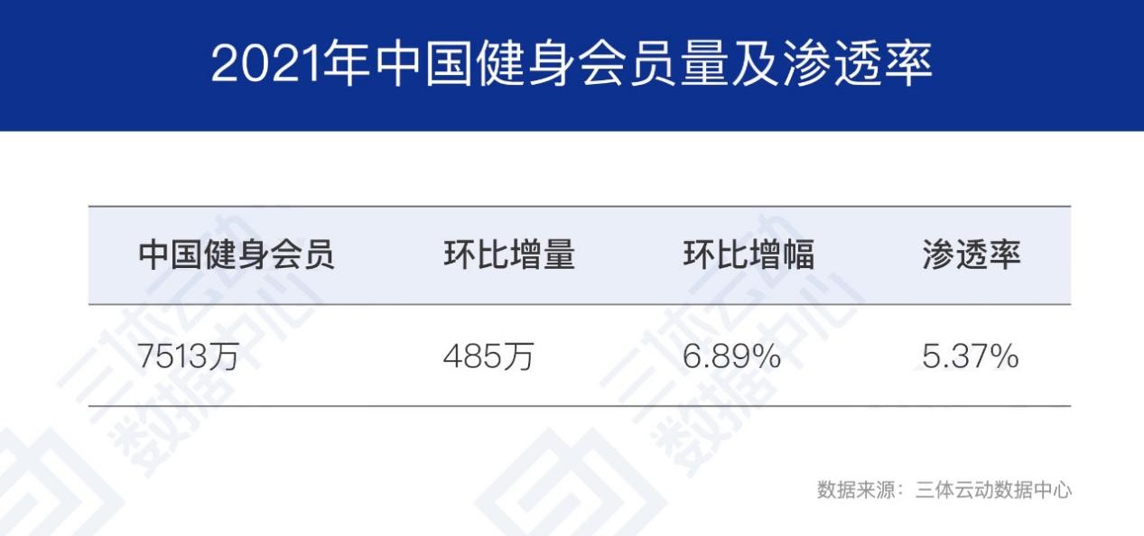 报告显示,2021年中国健身行业逐步回暖,健身会员和健身人口渗透率呈现出连续五年增长的态势,截至2021年12月,全国健身会员达到7513万人,相比2020年增长了6.89%,健身人口渗透率也从2017年的3.46%增长至2021年的5.37%。