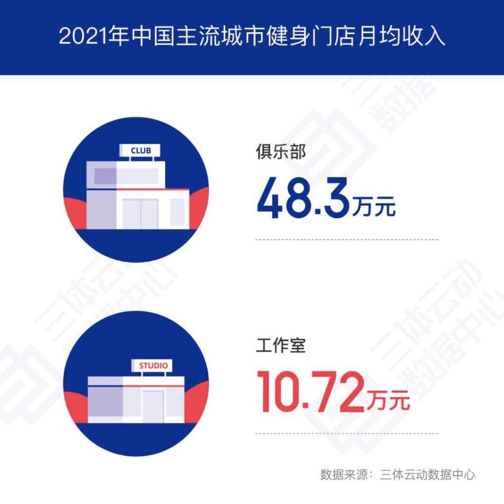 2021年中国主流城市健身俱乐部单店月均收入为48.3万元,相比2020年月均43.5万元增长11.0%,相比2019年月均53.6万元减少9.9%;2021年中国主流城市健身工作室单店月均收入为10.72万元,相比2020年月均9.63万元增长11.32%,相比2019年月均11.1万元减少3.42%。