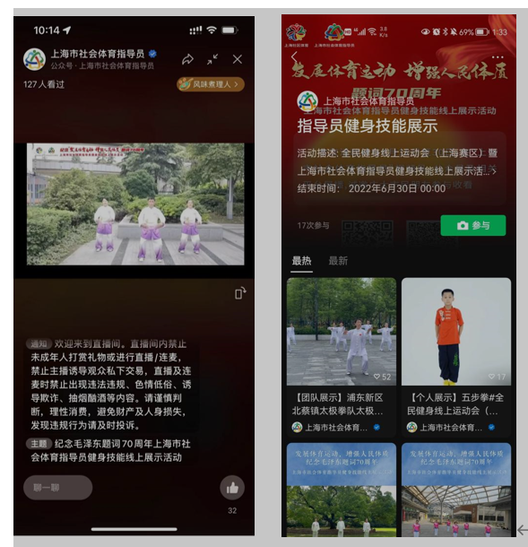 本次活动还设置了投票环节,根据各区展示团队投票排名将授予前8名“最佳展示奖”和视频号展示指导员“优秀宣传员”荣誉证书,并给每位参赛选手在“上海市社会体育指导员”小程序进行积分奖励,积分将用于参赛指导员日后年审、晋级或者评优等。活动第二天累积投票已达到6445票,投票浏览量22231次。
