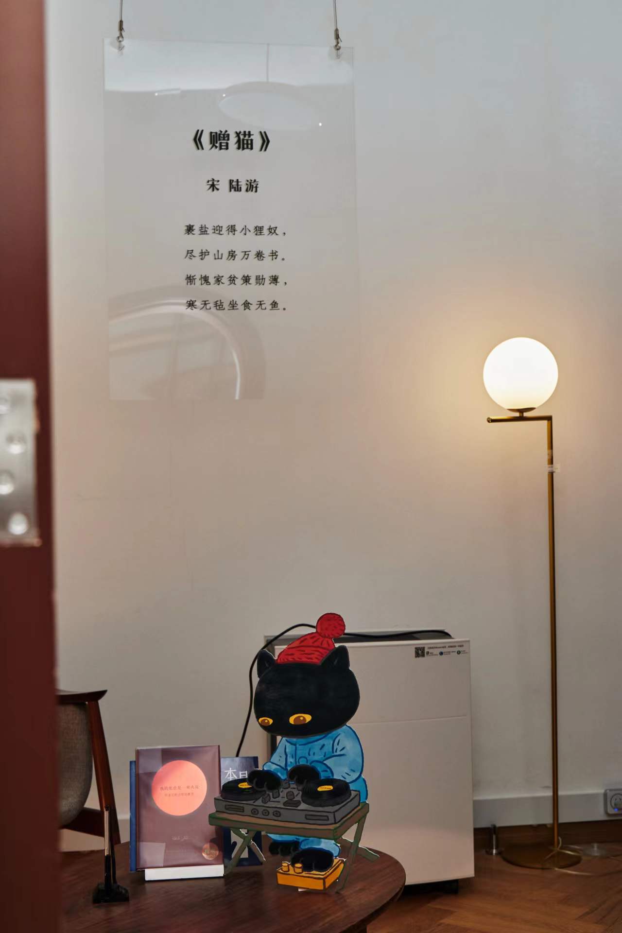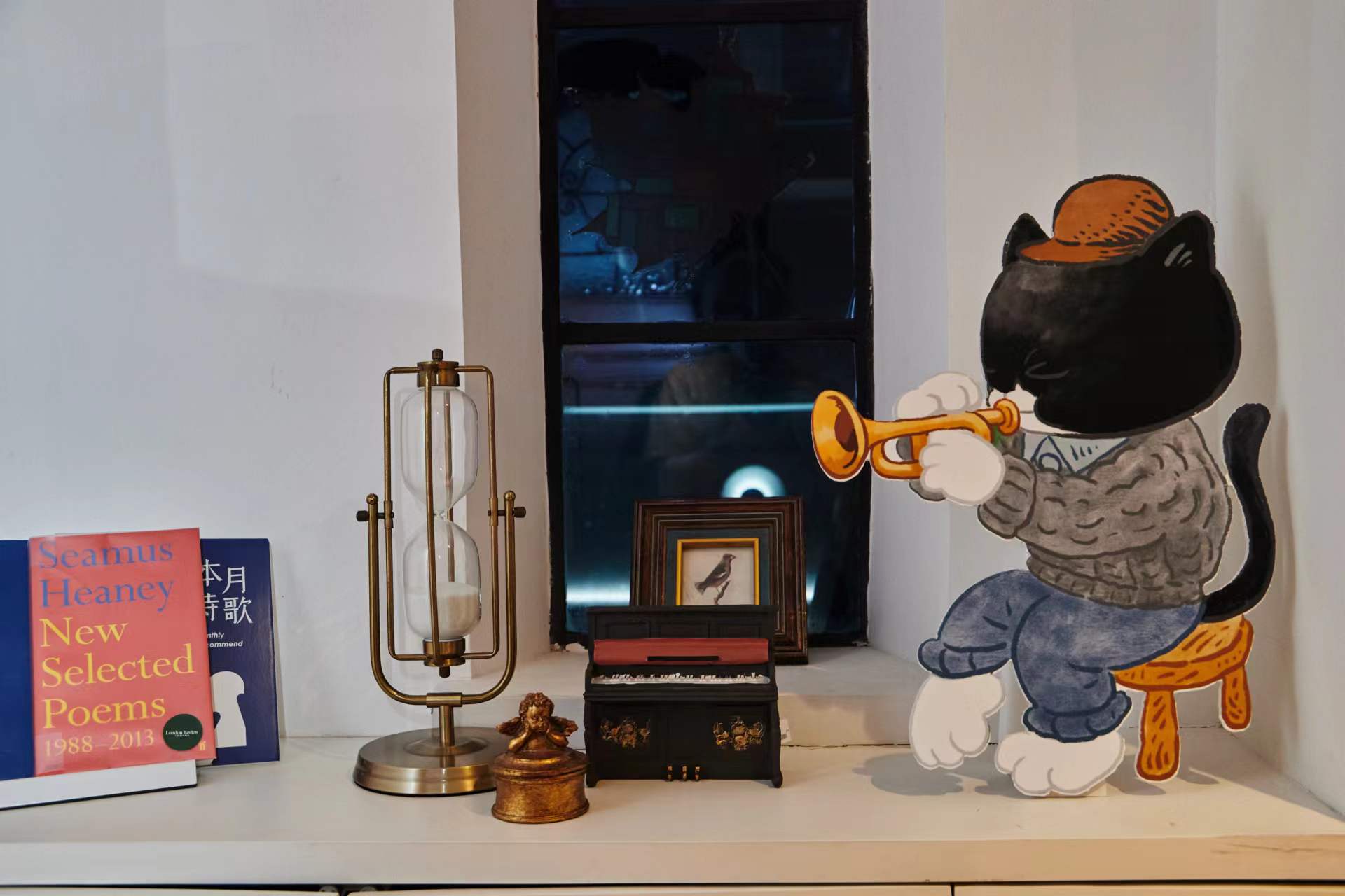 步入思南书局三楼展厅,春天恣意铺陈开来,四只性格迥异、酷酷的猫咪闪亮登场,它们想把春天演奏给你听。16幅画作里,藏着它们演出候场时,日常生活中的小秘密。在《爵士猫仔上场前》里有它们上场前的“例行操作”;在《寂静丛林》里藏着作品灵感来源的电影;在《Fly me to the East》有粘粘努力学习新乐器的身影;在《玩纸牌者》里展示了它们宅家最爱的小游戏;在《毛衣时尚》中它们cos了偶像当年的站位。