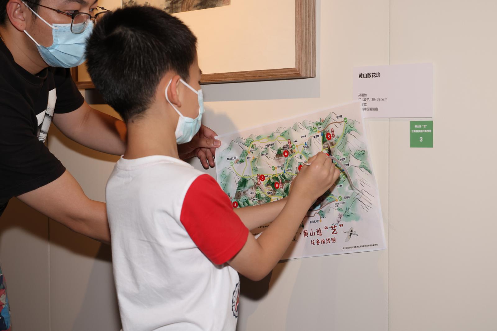 与展览开幕同步,程十发美术馆公共教育部围绕本次展览精心推出了三个线下活动。“黄山追‘艺’之旅”,通过精心设计的任务路线图,串联起当年画家在黄山的足迹与作品,引导“游客爬山打卡”。当“登顶”时,便进入了“乾坤大挪移”互动体验区,这里陈设了黄山展作品中的元素,观众可自由组合,体会画家布置山水的巧思。“妙笔生花——画出你心中的黄山”,给予观众一个充分释放灵感的空间,将实景黄山与画中黄山、心中黄山通过画笔诉诸画纸。