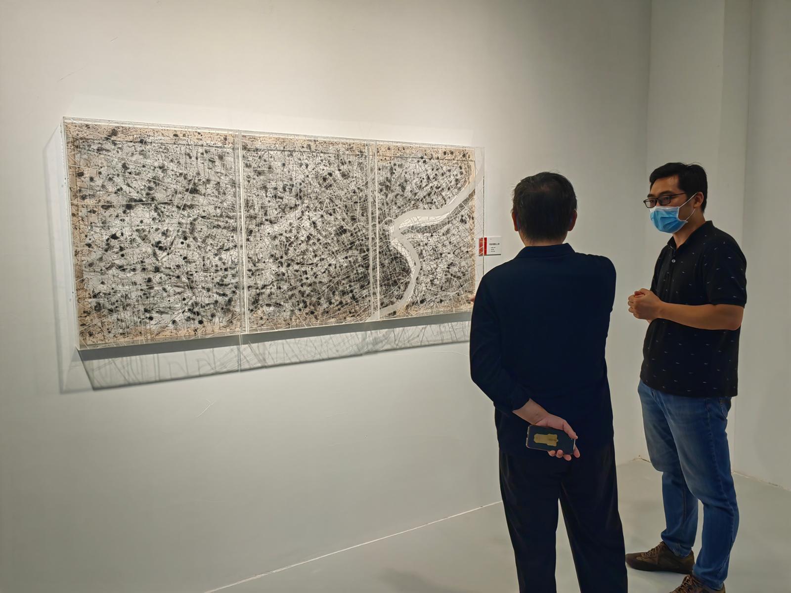 版画作品《嗨!魔都!》则以鸟瞰视角展示了上海浦东、浦西两岸的景色,现实中冰冷的钢筋混凝土森林、滔滔不绝的黄浦江水,在画家的刻刀下转换成充满温度的线条,讴歌了城市的活力。而司尚林的《中国式地图之上海》更是以地图为图示语言,以综合材料绘画为载体进行创作,底层的绘画加上表层的亚克力激光雕刻,双层叠加的呈现模式让人眼前一亮。