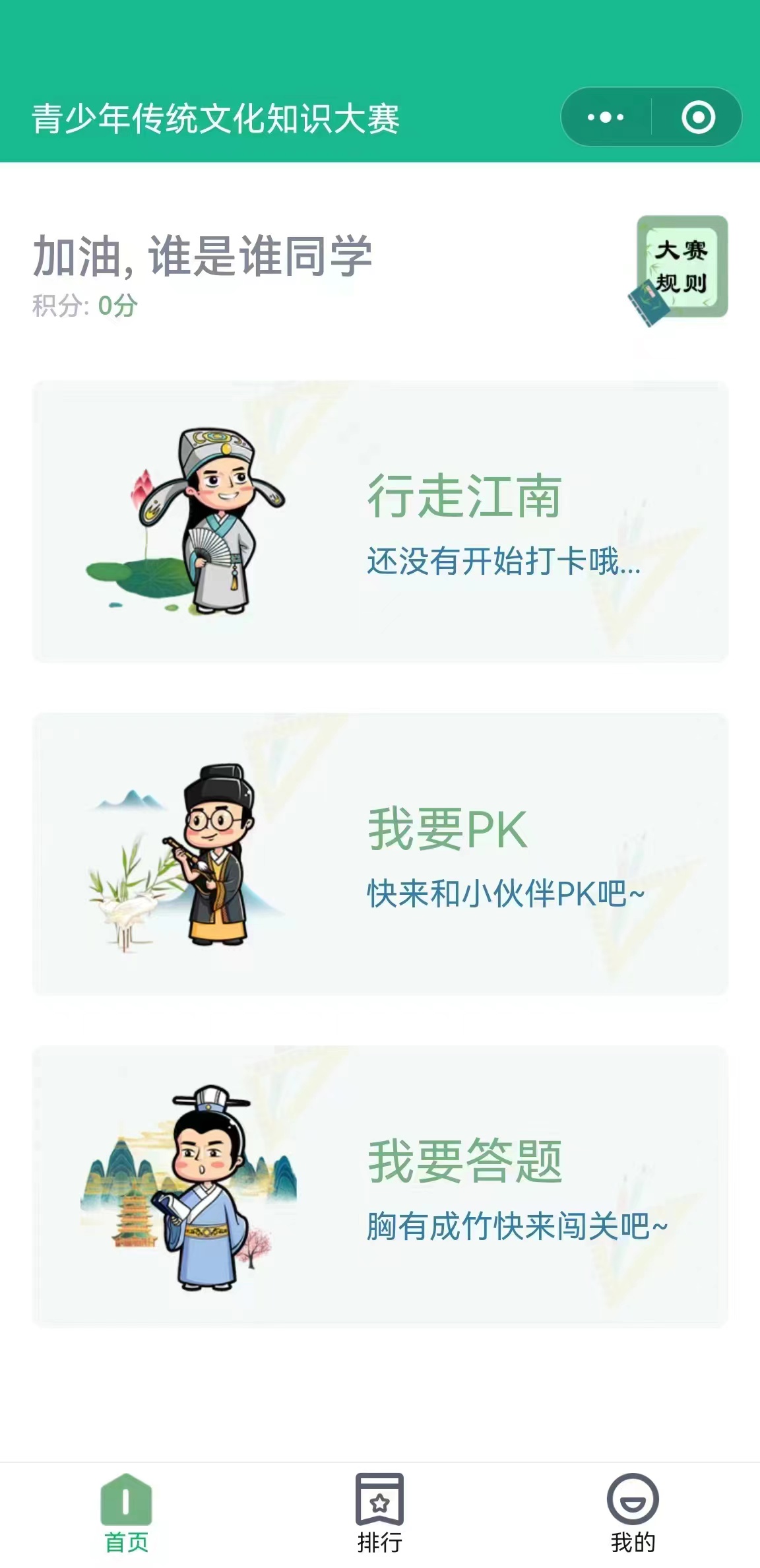与以往不同的是,本届青少年传统文化知识大赛全程在线上开展,选手们足不出户,线上打卡即可参与。记者通过扫描赛事小程序看到,其中有“行走江南”“我要PK”“我要答题”三个板块。
