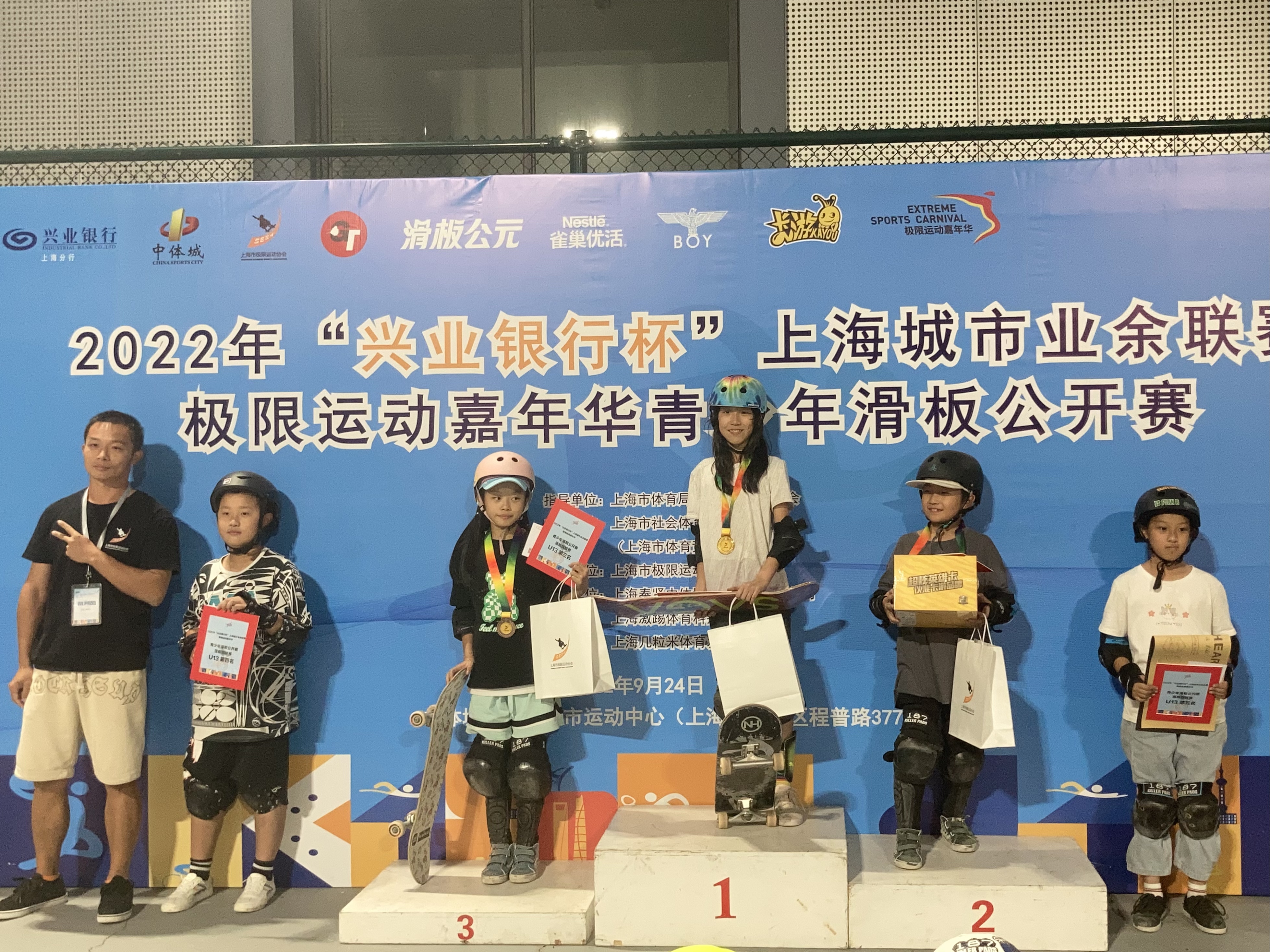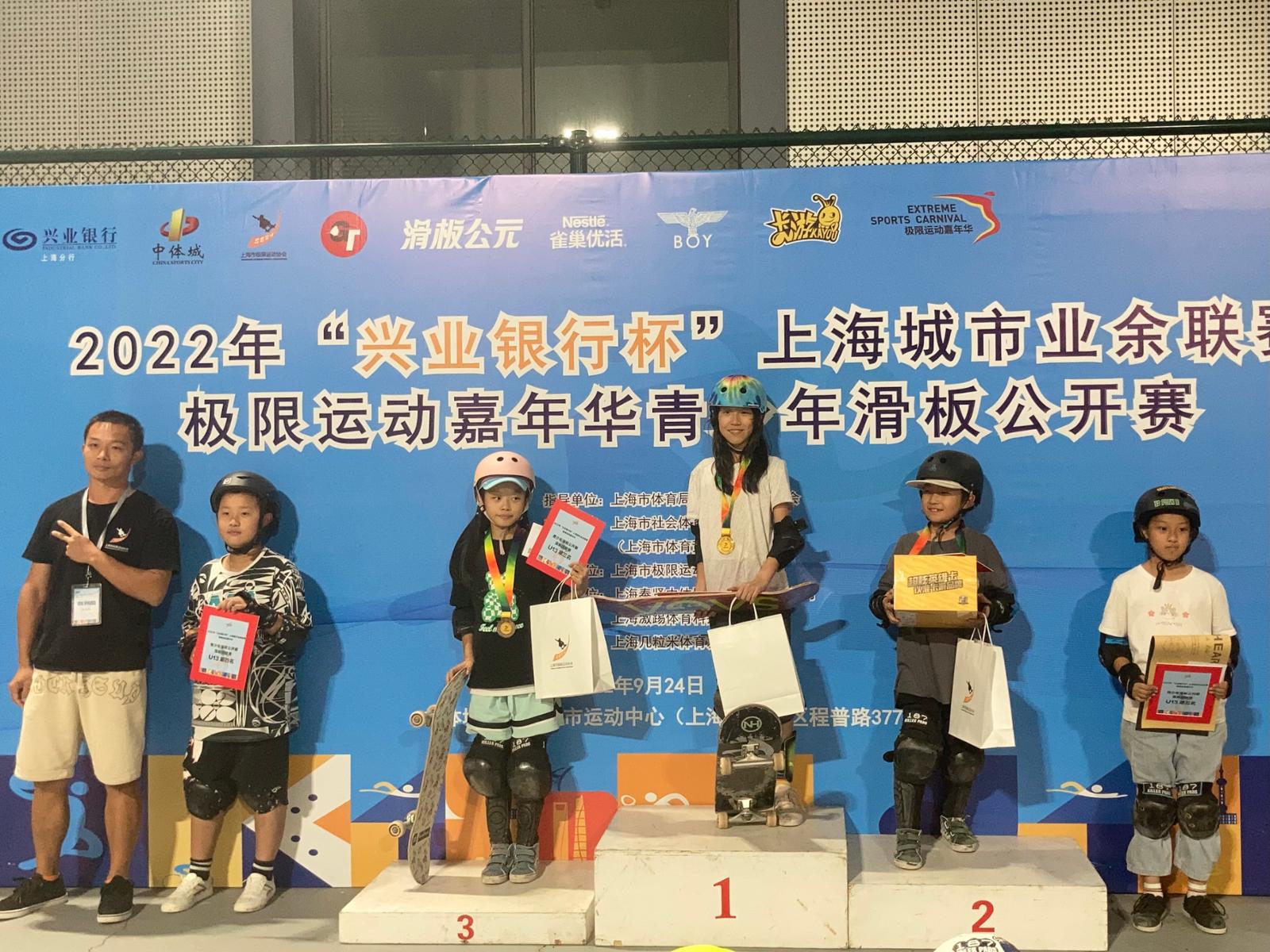 本次比赛共设置弧面道具赛、荡板绕桩赛和综合障碍赛三个项目,分U9和U13两个年龄组别。经过激烈角逐,范正骁、王诺萱、胡启航、周芮宇、郭翼宁斩获各项目的冠军。与往届不同的是,今年组委会还设置了体育道德风尚奖,蒋梓冉、王诺萱两位参赛选手与担任裁判的张家辰共同获奖。