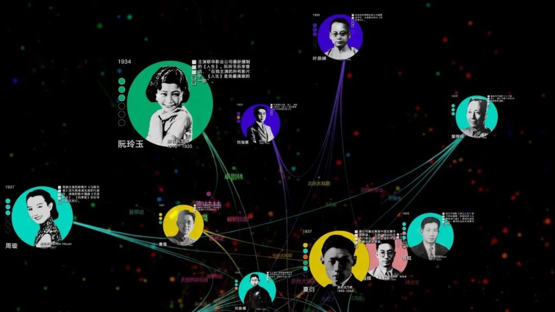 上海文化年谱数字展结合上海年华数据库资源,以TouchDesigner和Houdini为技术支持,将上海历史文化的发展演化具象为生长繁茂的大树。“枝干生长”模拟时间轴的不断延伸,体现文化史重要元素的关联与演进,“树”的意象则体现文化绵延不绝、传承有序的旺盛生命力。在这里,通过将同一年份段内的事件中关联的人物和地点串联起来,发现近代上海文化发展过程中人物、社会团体与地标建筑的相互关联,看到不同生活背景与文化领域的名人们不为人知的社交往事。