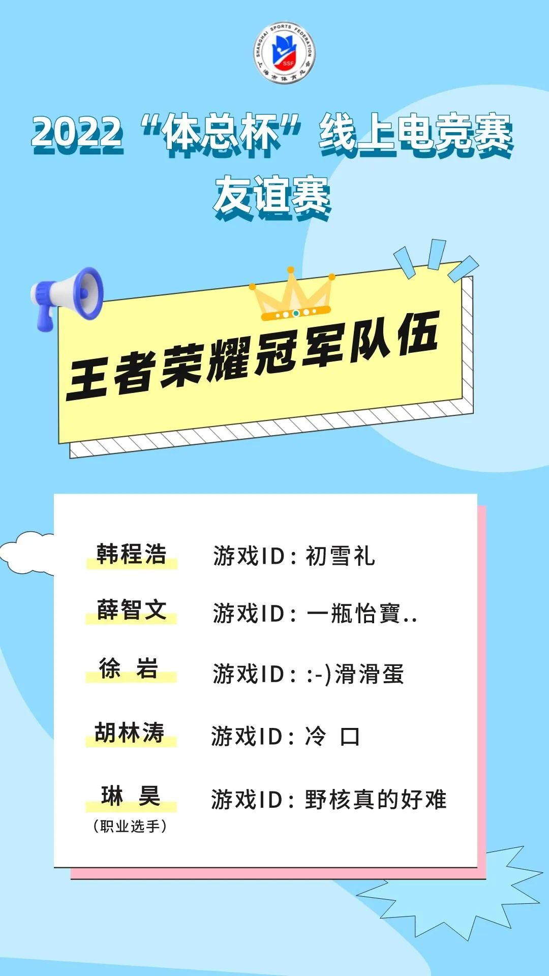 在全部赛事结束后,主办方别出心裁地推出友谊赛。友谊赛由职业选手和大众选手混合组队,获得2022年“体总杯”线上电竞赛——王者荣耀比赛前四名的队伍,每队推选4位选手,组成16人大众组队伍。大众组选手交叉组队,由裁判随机抽签4人一组,与职业组1人组成新的战队。职业组邀请江苏昆山SC俱乐部4名职业电竞选手琳昊、无忧、水瓶、执剑参赛,1人分别带领一支队伍参赛。故每支参赛队伍包含1名职业组选手和4名大众组选手。每支战队5人,组成4支“终极”战队。