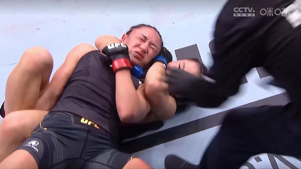 开场之后,张伟丽打得积极主动,显示出站立击打的优势。而且,经历过多次冠军赛的争夺,张伟丽已经完成了心态和技术上的升级。面对摔跤出身的卡拉,张伟丽在第一回合曾被摔倒,但她以强大的力量迅速摆脱,并且一度接近对卡拉形成裸绞;第二回合,卡拉更早进入摔跤模式,这一次,伟丽打出了惊艳的表现,迅速撤胯,利用力量压制卡拉,锁住对手的脖子,迫使对手拍手认负,以对手最擅长的方式取得胜利。