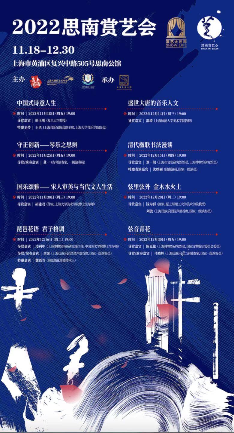 12月6日,上海民族乐团演奏家俞冰领衔的琵琶声部,将携手上海博物馆书画研究部主任凌利中、海派插花非遗传承人魏语萱,在琵琶之声、中国古画与插花艺术中, 共同呈现新的东方“空间美学”。此外,还有《盛世大唐的音乐人文》、《清代楹联书法漫谈》、《弦里弦外金木水火土》、《弦音青花》等多场演出,寒冷冬日,好戏连台。