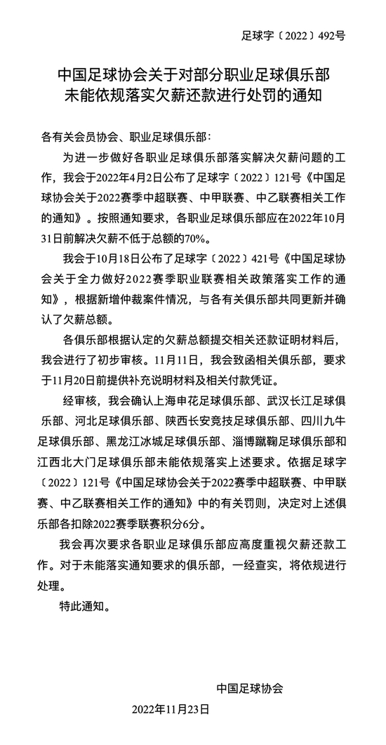 23日,中国足球协会发布关于对部分职业足球俱乐部未能依规落实欠薪还款进行处罚的通知。经审核,上海申花等8个俱乐部未能依规落实相关要求,被扣除2022赛季联赛积分6分。
