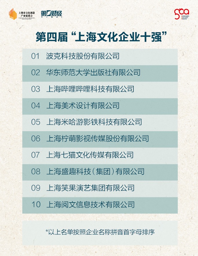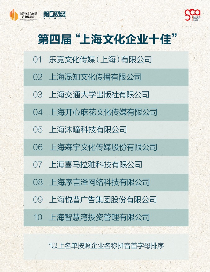 文化是一座城市的精神名片。11月24日下午,第四届上海文化企业十强、十佳、十大年度人物、十大创新人物和上海十大文化品牌获奖名单揭晓。笑果、哔哩哔哩等入围“十强”,开心麻花、喜马拉雅等获评“十佳”,舞剧《永不消逝的电波》领衔“上海十大文化品牌”。