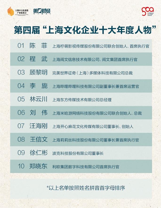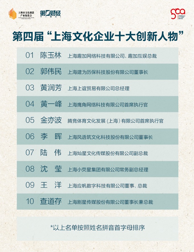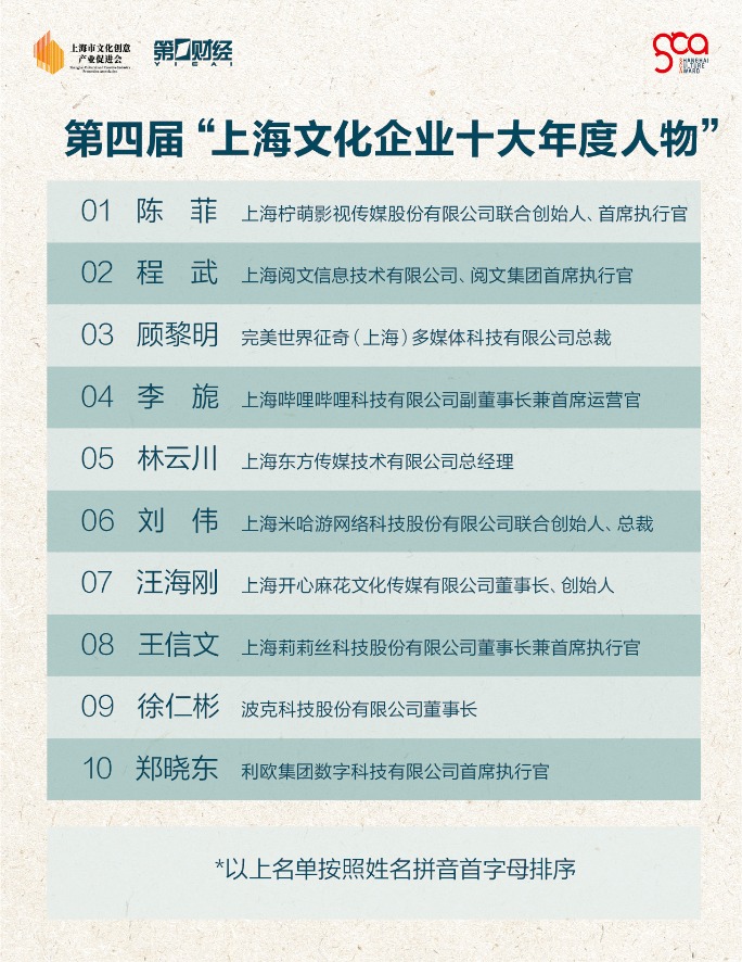 此外,十大年度人物和十大创新人物的获奖者为各细分文化领域内具有代表性和开创性的企业领军人。上海柠萌影视传媒股份有限公司联合创始人陈菲等10人入选,上海趣加网络科技有限公司、趣加互娱总裁陈玉林等10人荣获“十大创新人物”称号。