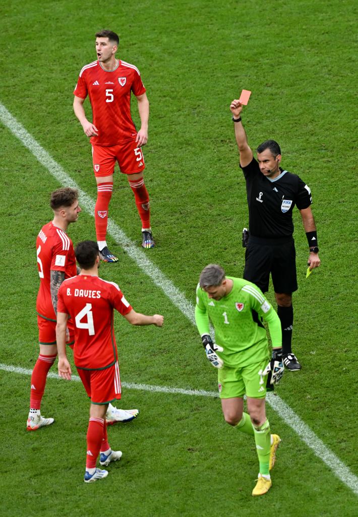 值得一提的是,本场比赛还诞生了本届世界杯的第一张红牌。第84分钟,伊朗后场断球后发动反击,威尔士门将亨内西冲出禁区撞倒塔雷米。在VAR介入后,当值主裁判取消了给亨内西的黄牌,直接出示红牌将其罚下。