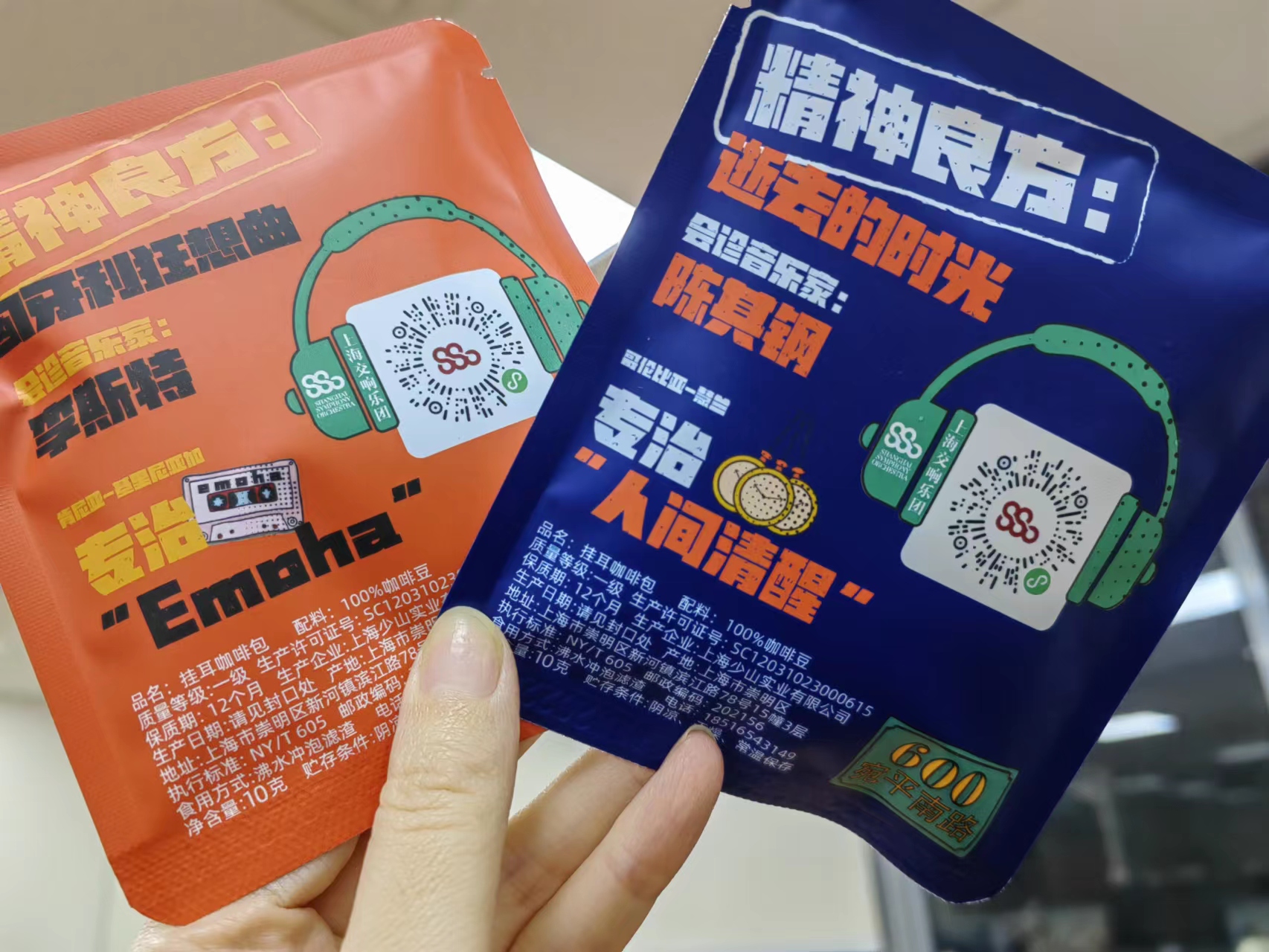 而在咖啡包的背面,上海交响乐团则给出了“治愈良方”,巴赫、贝多芬、德彪西、李斯特、陈其钢等中外十位作曲家化身“会诊医生”,将《钟》《月光》《匈牙利狂想曲》等十首不同风格的交响乐作品放入一旁的二维码内。当你在品尝香浓咖啡的时候,只需扫码就可以聆听这些大师的作品。