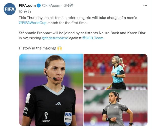 最新的消息显示,国际足联已经在11月30日凌晨宣布,由三名女裁判组成的裁判组将吹罚E组最后一轮德国对阵哥斯达黎加的比赛,其中,来自法国的斯蒂芬妮·弗拉帕尔将担任本场比赛主裁判。在此前墨西哥对阵波兰的比赛中,弗拉帕尔担任第四官员,成为首位亮相世界杯舞台的女裁判。
