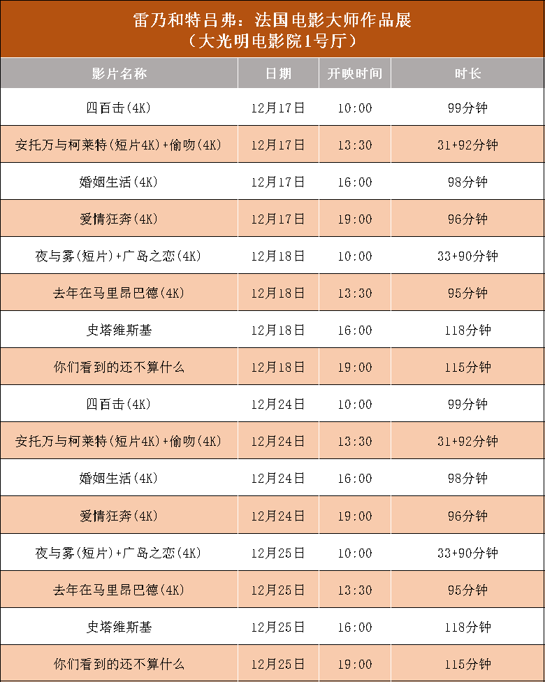 本次影展将完整展映特吕弗的“安托万五部曲”,包括被誉为新浪潮运动“开山之作”的《四百击》。雷乃的作品则遴选了早期留名影史的短片《夜与雾》,第一、二部长片《广岛之恋》和《去年在马里昂巴德》,中期与法国知名演员让·保罗·贝尔蒙多合作的《史塔维斯基》,以及晚期融合戏剧的代表作《你们见到的还不算什么》。
