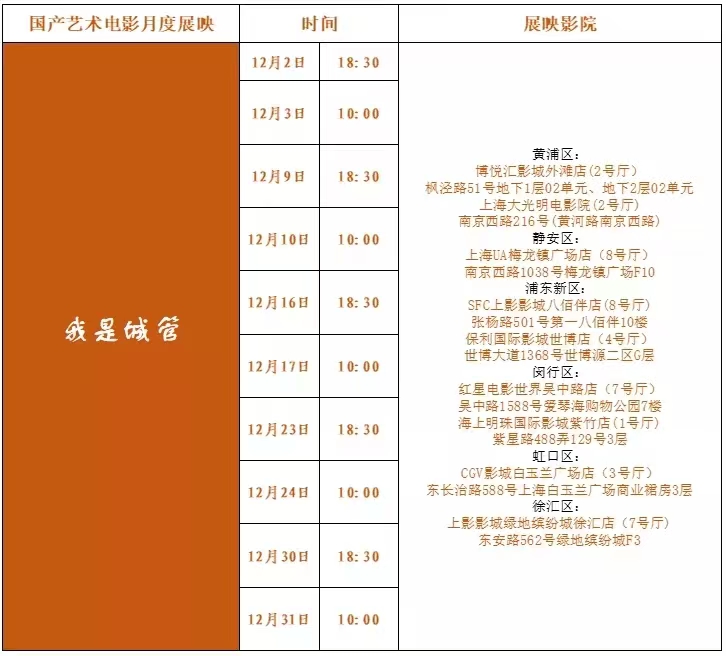据悉,从12月2日至31日,《我是城管》将在上海艺术电影联盟下的10家影院展映。