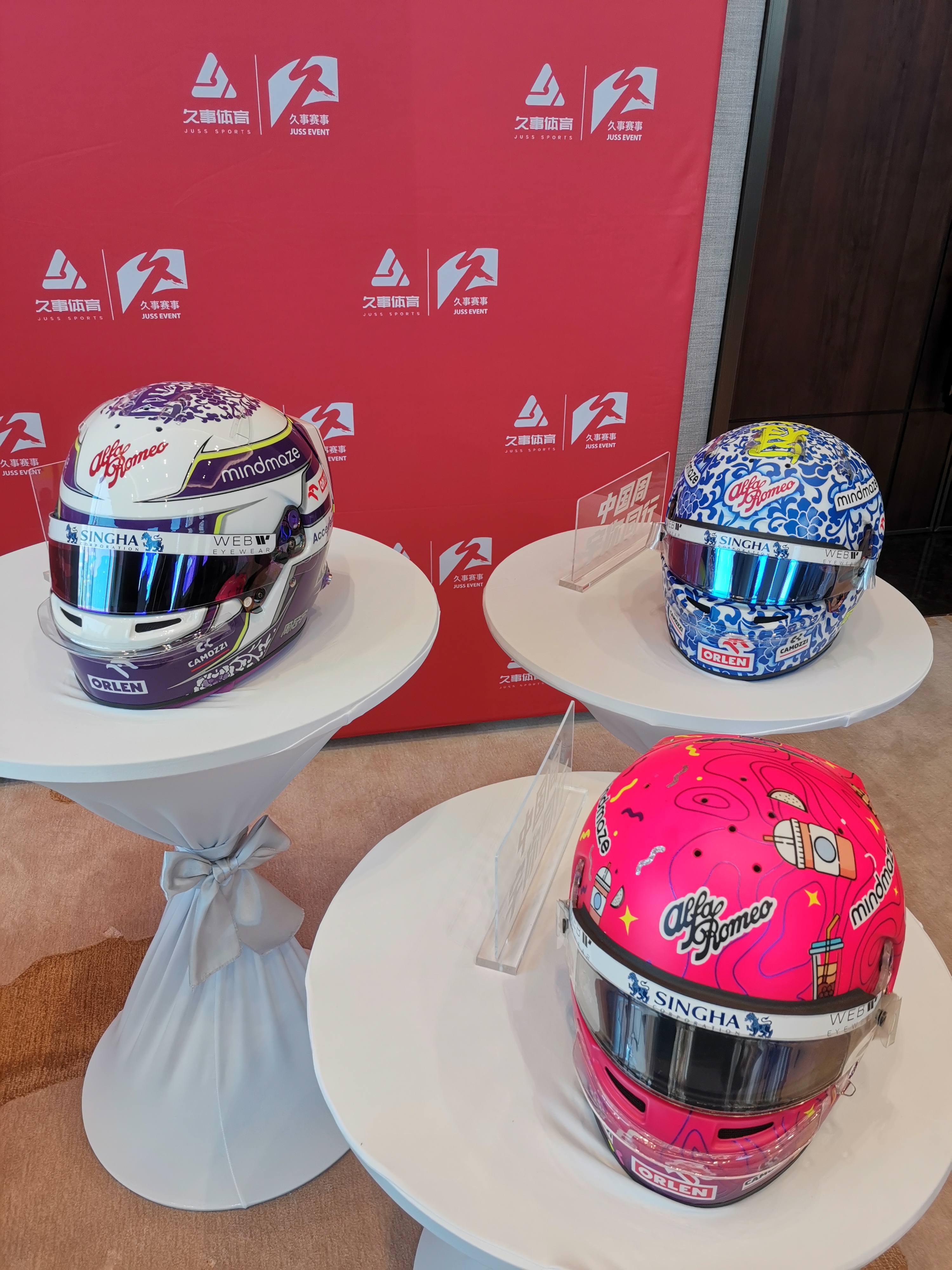 周冠宇在世界会客厅接受采访之时,右手边是浦江美景,左手边是他所使用的三款头盔。一款头盔是车迷比较熟悉的青花瓷,曾经在阿布扎比在使用。一款是新加坡站使用的头盔,上面有上海标志性的天际线。还有一款是新加坡站使用的头盔,上面有一些奶茶图案和周冠宇的表情包。