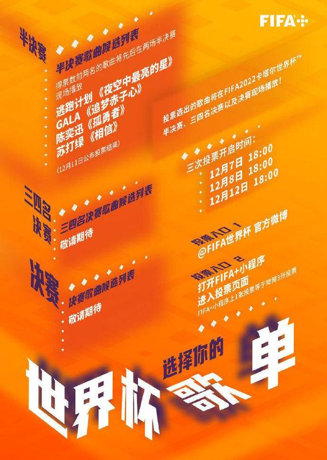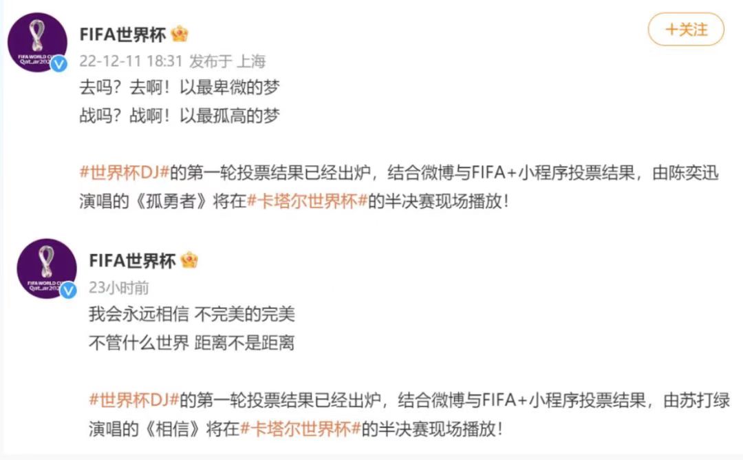 其实,一周之前,世界杯1/4决赛结束后,FIFA就开始通过社交媒体在全球各个国家征集世界杯暖场曲目,并通过小程序、官方微博等发布了“世界杯现场播放的中文歌曲由你来决定”的活动,让网友们在相关页面上投票。