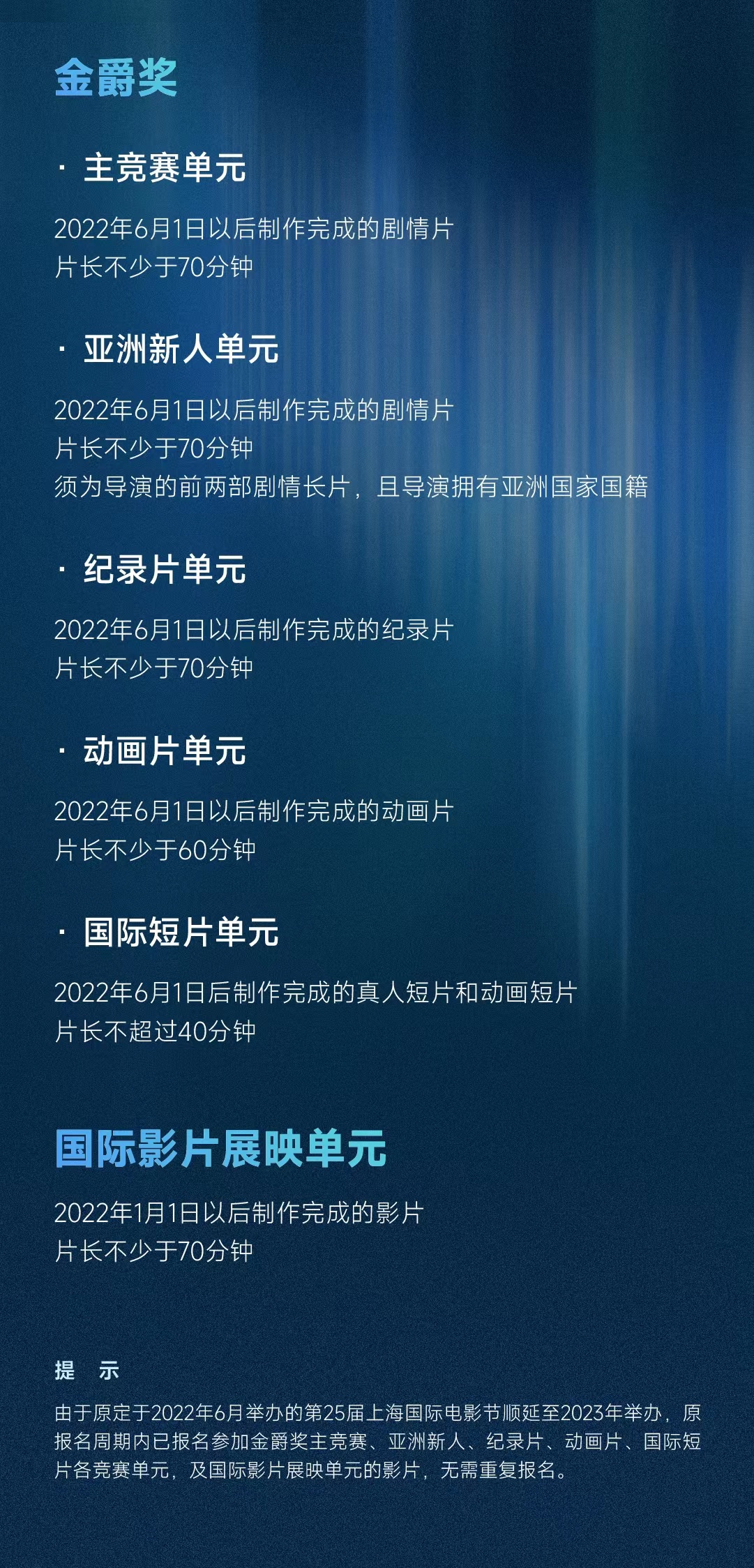 由于原定于2022年6月举办的第25届上海国际电影节顺延至2023年举办,原报名周期内已报名参加金爵奖主竞赛、亚洲新人、纪录片、动画片、国际短片各竞赛单元,及国际影片展映单元的影片,无需重复报名。