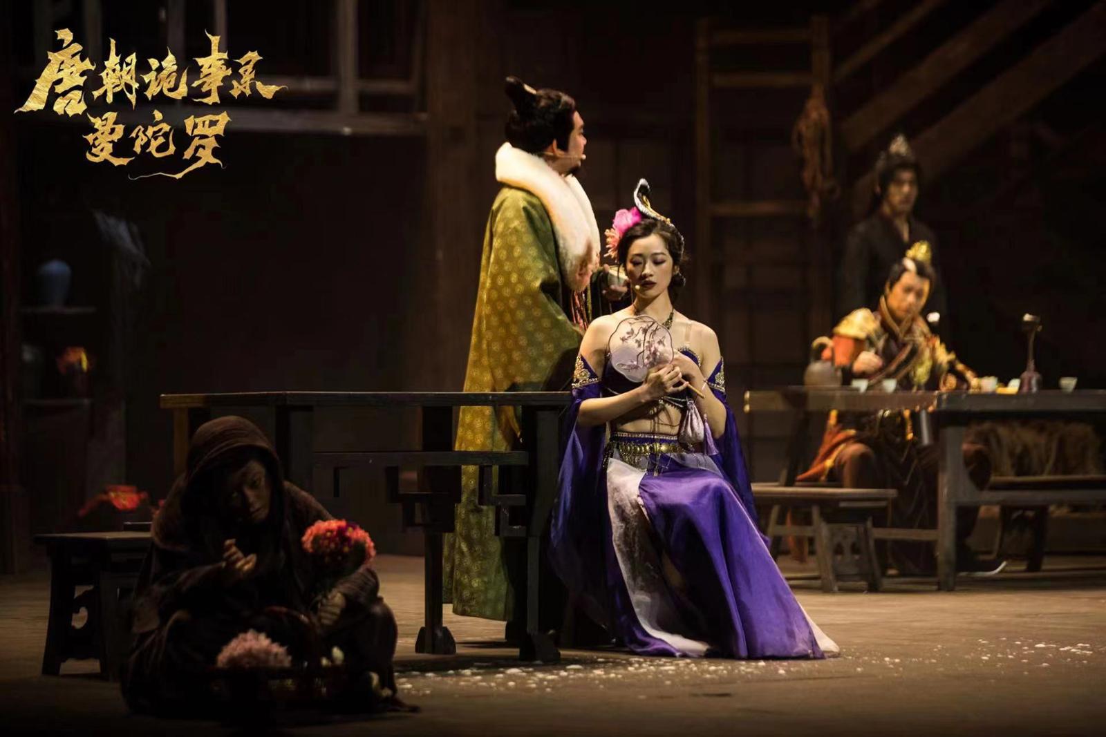 全剧的音乐呈现都是通过竹笛、古筝、木鱼、鼓声、唢呐等国乐乐器来完成。表演之中,也不乏汉文化元素的加持和赋能。演员文嫣饰演的曼陀罗花以中国舞的柔美体现曼陀罗的妖娆曼妙唤醒人们的欲望,飞扬的裙裳更显飘渺,剧中将军徐自的唱词融合了类似京剧的西皮流水唱腔,曲调更显跌宕,气势高昂。