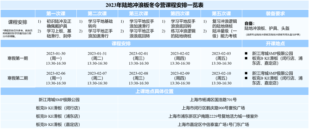报名参加课程的学员要自备专业滑板/陆地冲浪板、护具和头盔,具体信息可以在公众号“上海市极限运动协会”内回复关键字“寒假冬令营报名”,获取报名链接和相关信息。