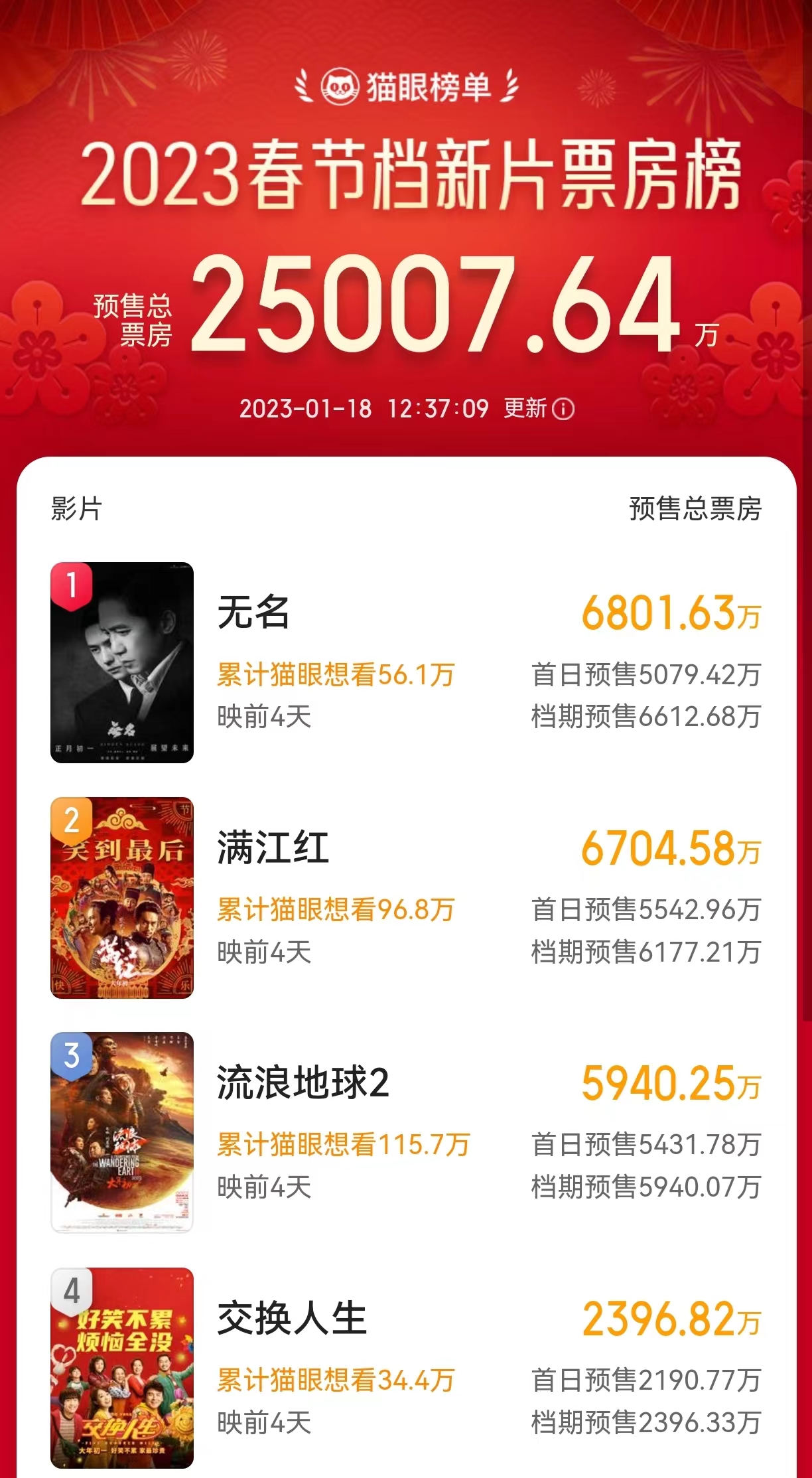 根据猫眼专业版数据显示,截至记者发稿,《满江红》的预售票房已突破6884.6万元,位列春节档电影预售票房榜首;《无名》则凭借6873.8万元的预售票房,位列预售票房第二位。两部电影预售票房之和已占据春节档电影票房的“半壁江山”。