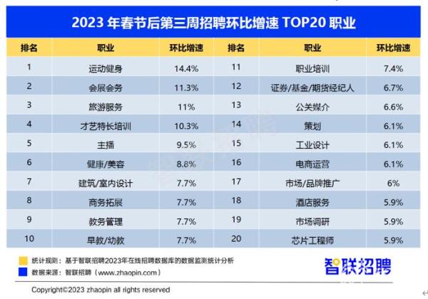 而根据智联招聘在2月18日发布的第三期《2023年春招市场行情周报》,随着节后健身馆、体育馆渐次开放,健身招聘需求上涨较快,节后第三周,运动健身仍然占据招聘职位数环比增速榜首位,环比增幅达14.4%。而在前一周,该数据更是达到51.2%。