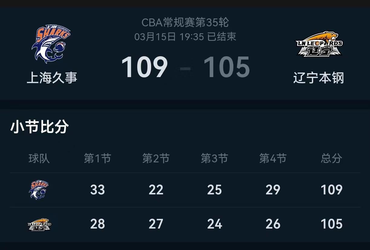 3月15日晚,2022-2023赛季CBA常规赛第三阶段迎来一场焦点战,上海久事男篮主场迎战卫冕冠军辽宁队。经过四节厮杀,最终,大鲨鱼109比105险胜辽宁男篮,成功复仇。
