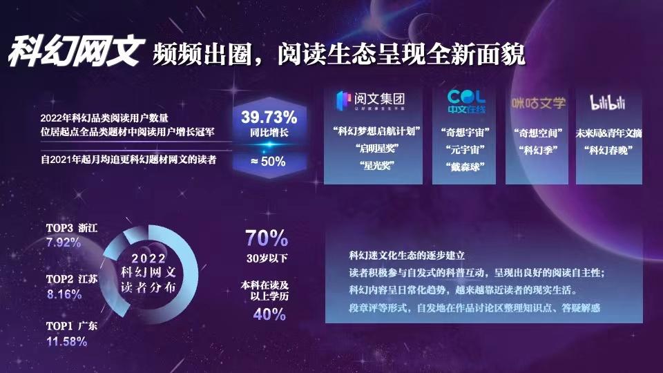 白皮书数据显示,在2022年,起点中文网发布了42080部科幻网络文学作品,原创科幻网络文学作品签约量增长30%,是热门品类增长的第一名,规模仅次于作为传统网文品类的玄幻与都市类别。
