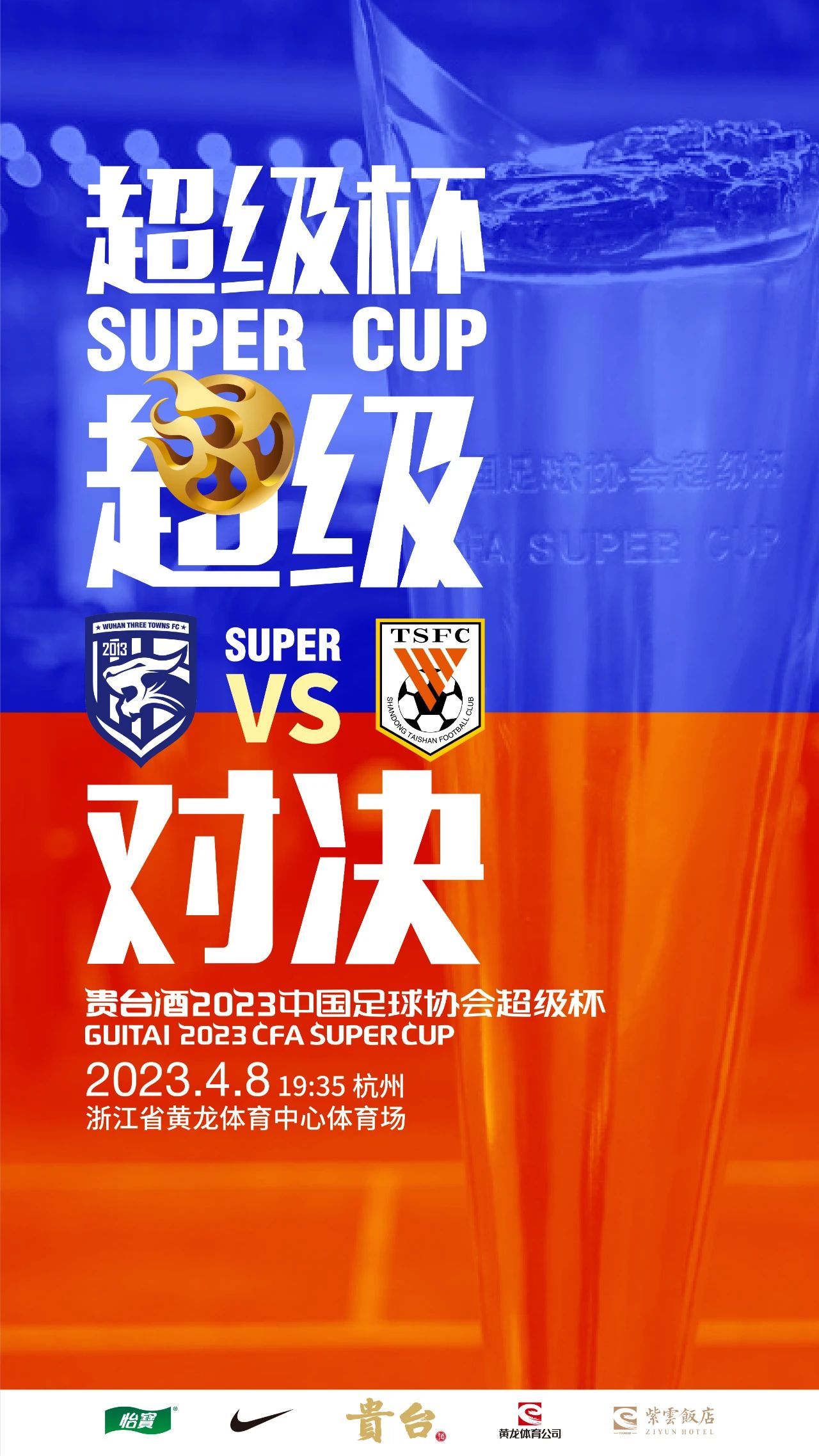 2023中国足球协会超级杯赛将于4月8日晚在浙江杭州黄龙体育中心体育场正式打响。2022中超联赛冠军武汉三镇队和2022中国足协杯冠军山东泰山队将在数万球迷的注视下,上演强强对话,决出新赛季首个冠军头衔。