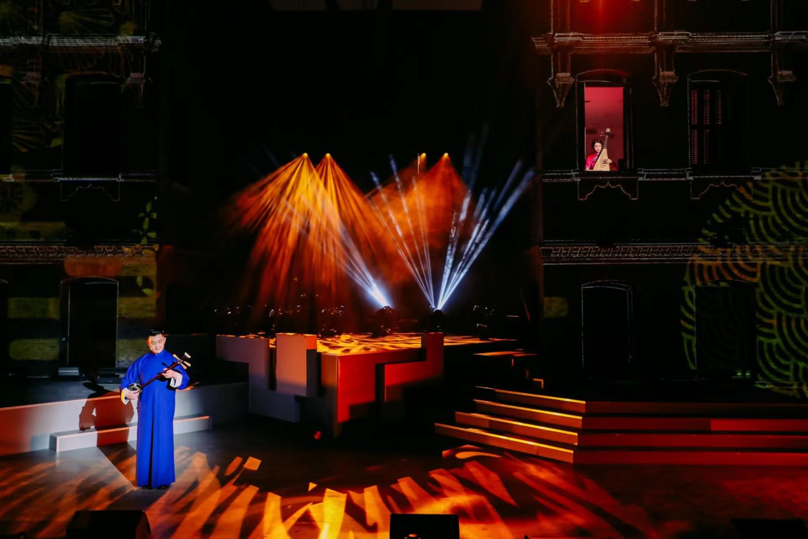 不仅如此,针对不同曲目的曲风,此次音乐会的声、光、影均为定制。比如开场曲《念奴娇序》,讲述的是唐明皇与杨贵妃大婚的场景,因而整体舞台就彰显着浓墨重彩的皇家气派;当唱至婉转幽静的《懒画眉》时,灯光和投影又转为了恬然深邃的风格;而当爵士、朋克、昆曲实验性融合的压轴曲《折桂令》唱响时,光影则变得轻快而有节奏感。
