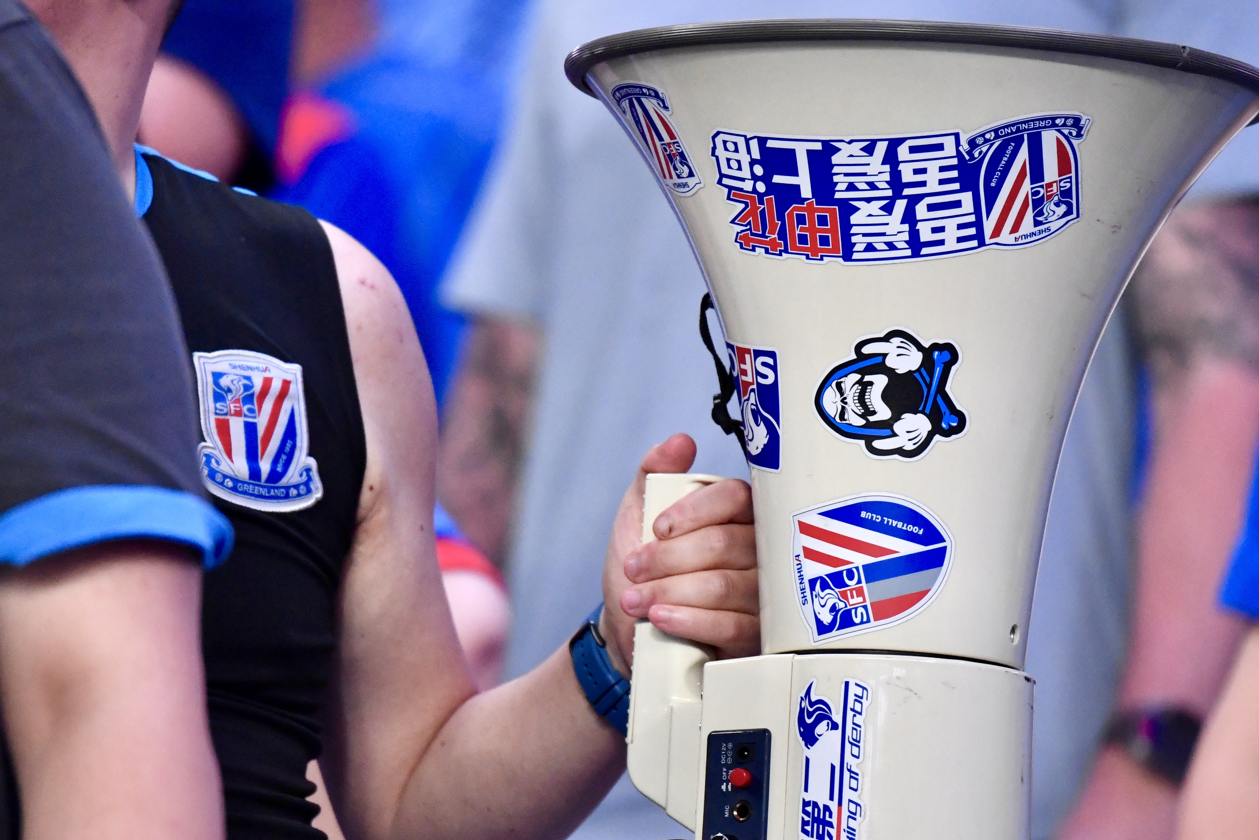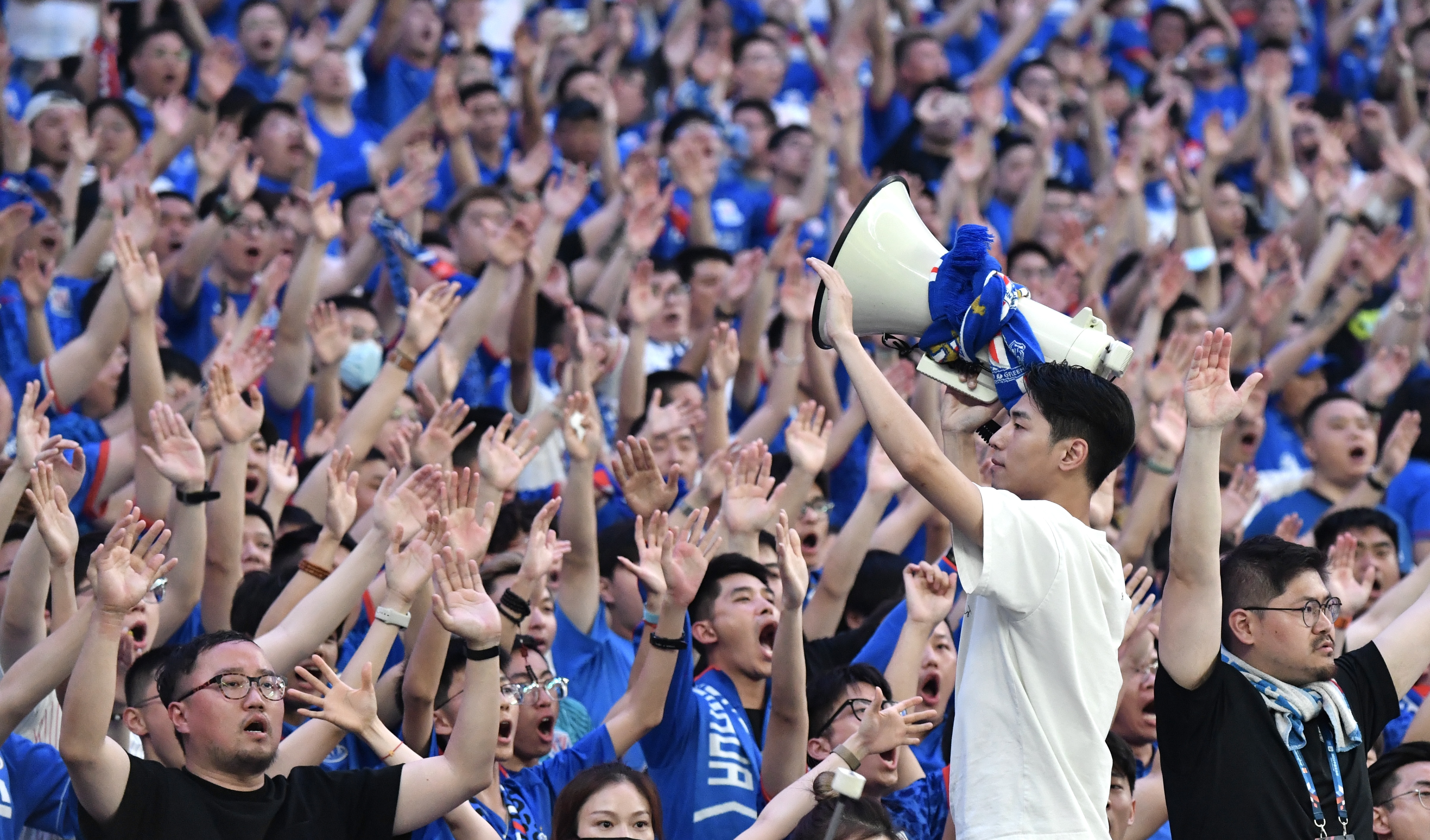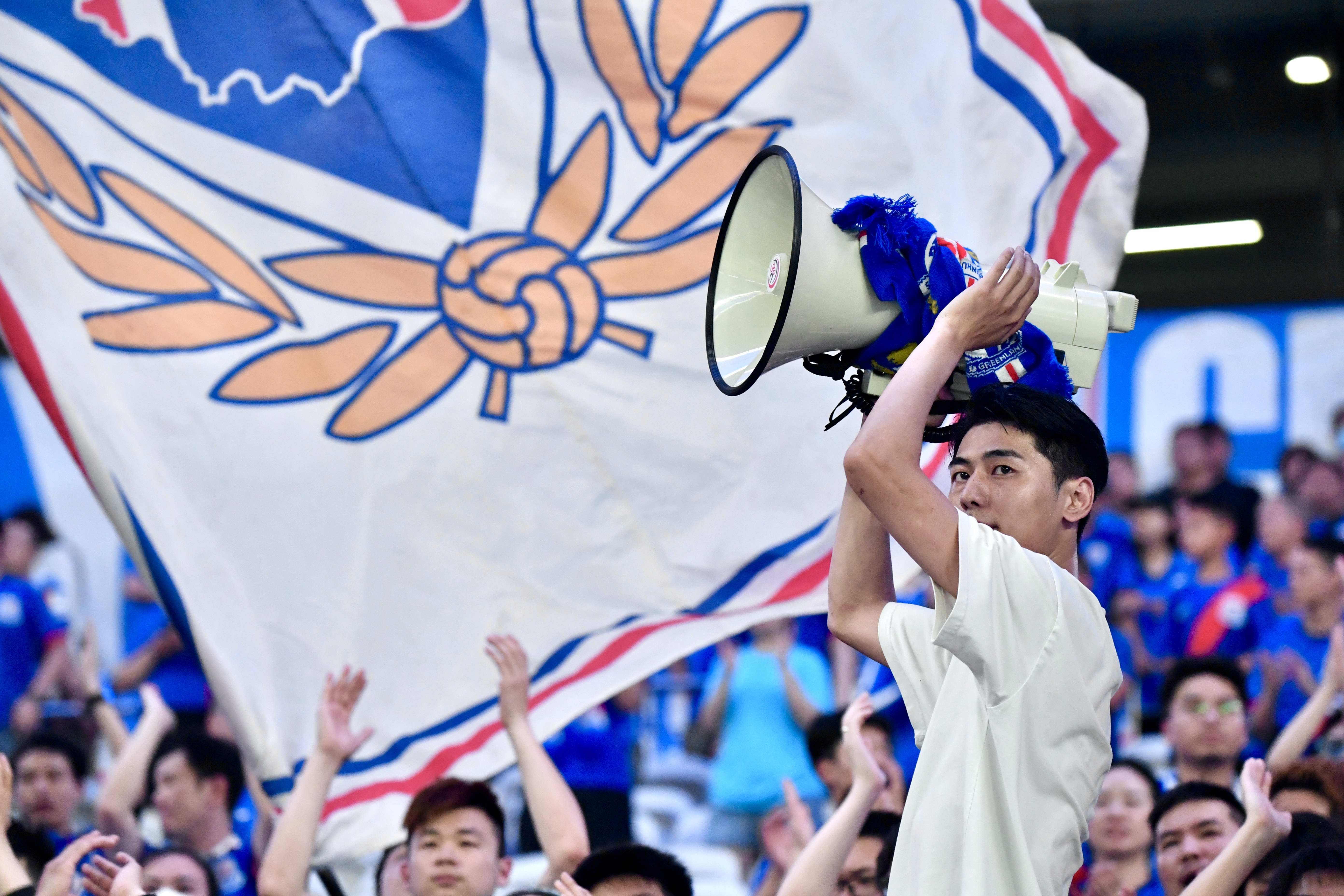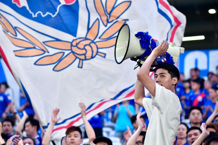 挥舞的战旗和高分贝喇叭,是球迷助威的标配。劳动报记者贡俊祺 摄影