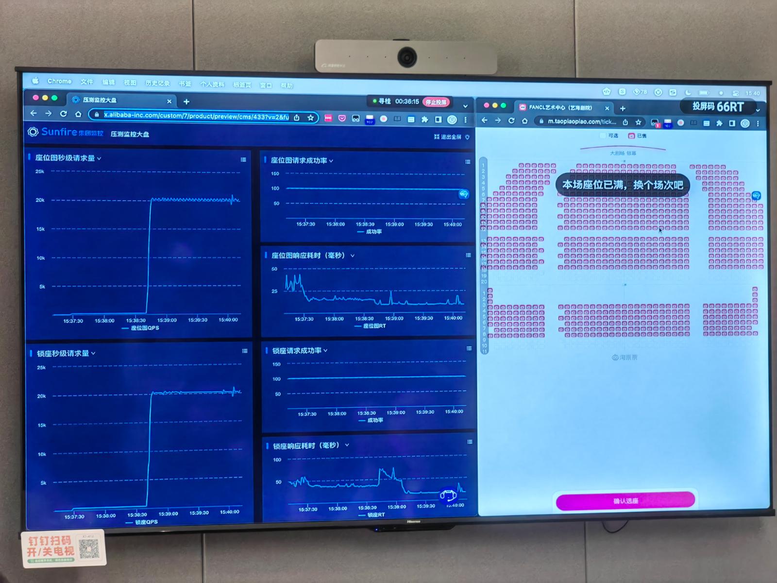 一边说着,一旁的孔啸立刻就演示了起来。记者在淘票票后台测试屏上看到,当左侧的座位图秒级请求量从0瞬间飙至2万,购票系统依然保持着流畅。“虽然普通用户可能感觉跟平时自己买电影票选座没什么区别,但其实他们可能是面对十几万人同时在选座的后台。”