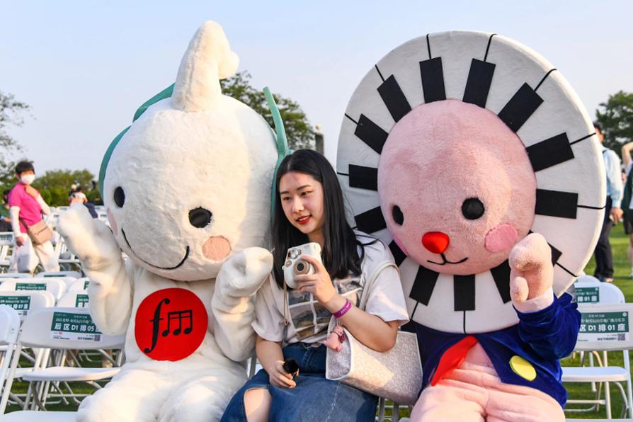 观众与音乐节吉祥物合影。颜筱依 摄影