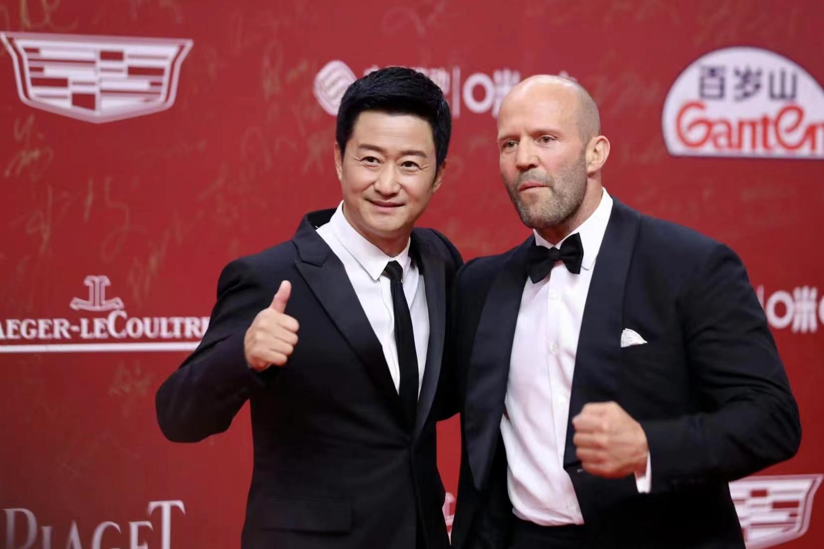 吴京、杰森·斯坦森亮相上影节红毯。劳动报记者贡俊祺 摄影
