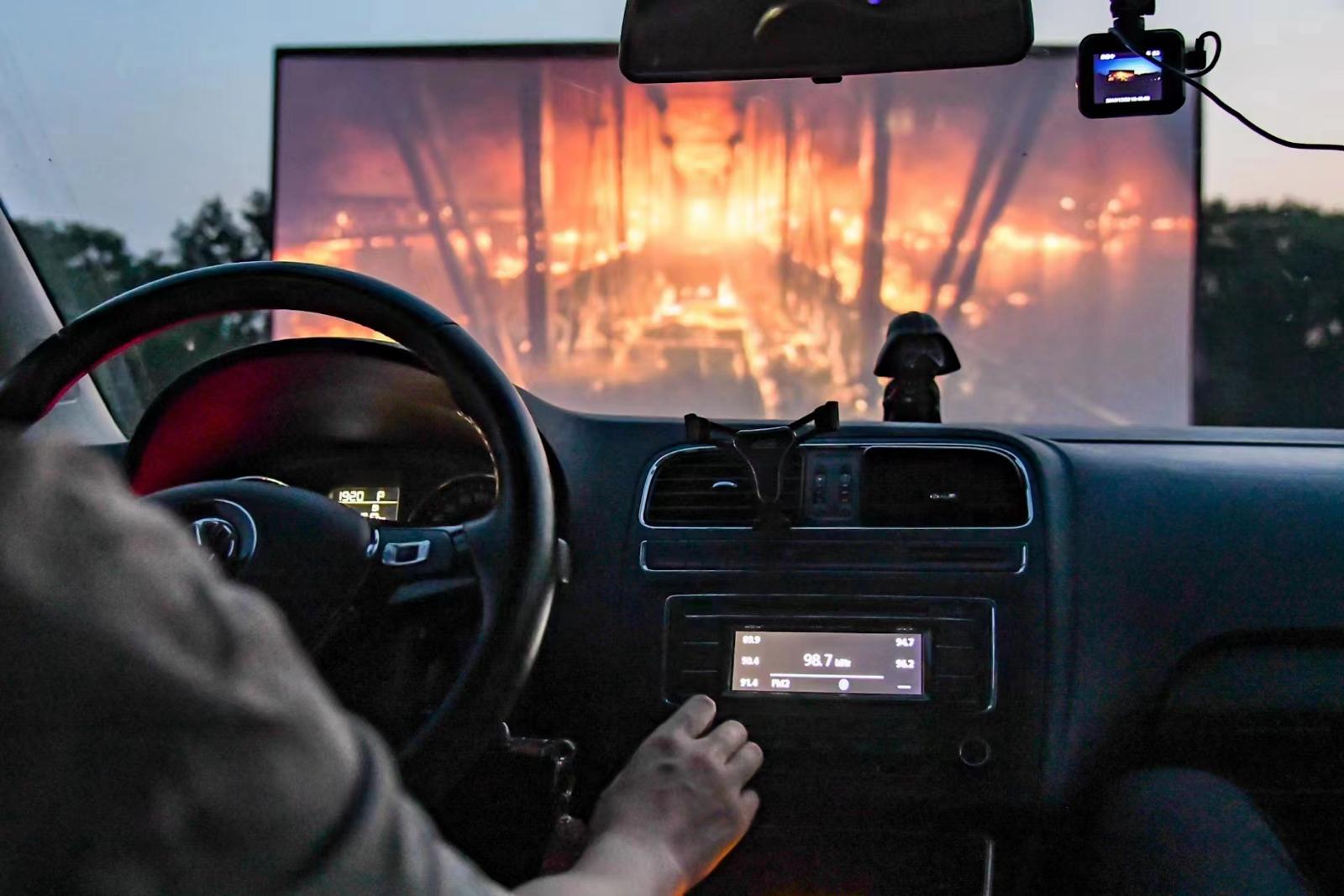 打开车载收音机接通指定频率就能观影。颜筱依 摄影
