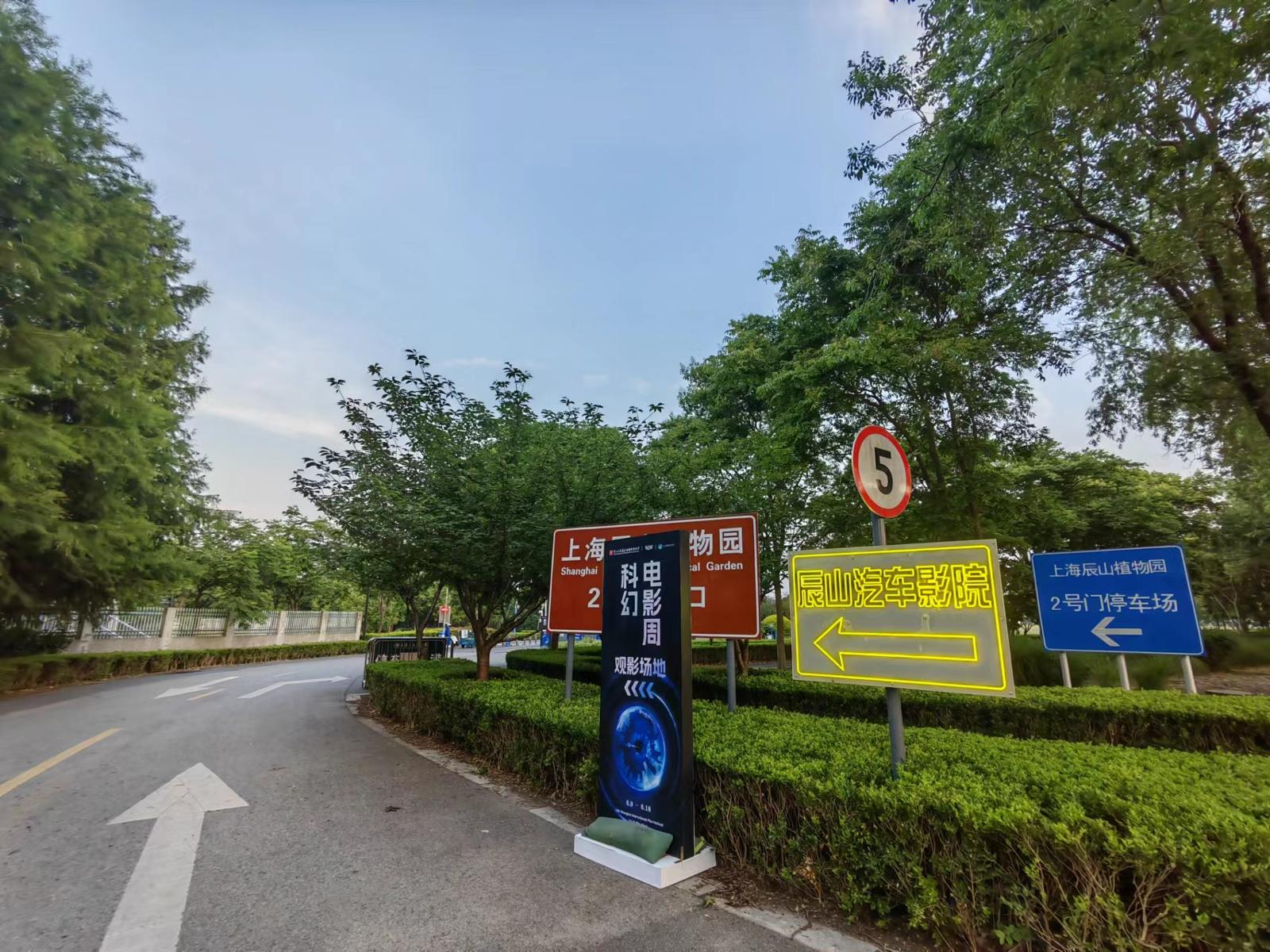 当天晚上6点半,记者到达辰山植物园时,还没走进汽车影院,电影节的氛围已经扑面而来:停车场入口处,印有“星眸落沪”的科幻电影周主题海报在马路两边迎风飘扬,顺着霓虹指示牌往里走,远远就能看到两块巨型银幕坐落在辰山脚下。