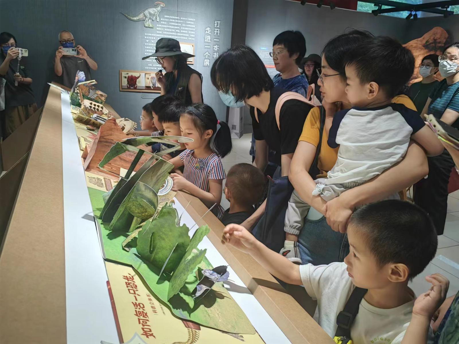 上海海派连环画中心总编辑刘亚军告诉记者,人类对恐龙的疑问、好奇和想象一直很多。经过多年筹备,今年6月,上海科技馆原创立体书《如何复活一只恐龙》面世,通过7大场景、29个立体纸雕、38个增效翻页、16个互动机关、83幅科学绘画,让恐龙从书籍里“吼叫起来、站起来、动起来”。而此次“恐龙复活记”展览,则是将这本长达7.6米的立体书进行了生动还原。