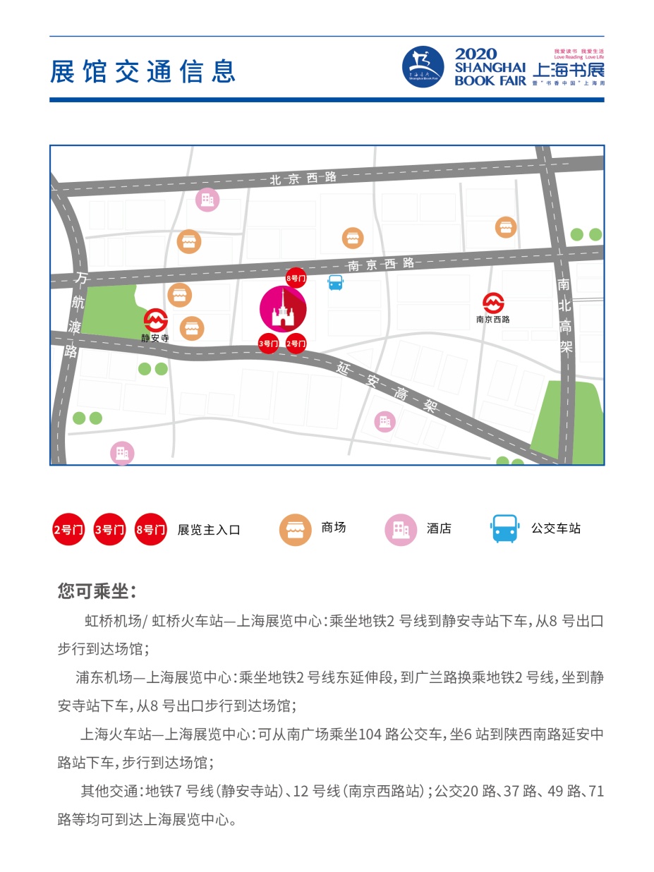 2023上海书展设置位于延安中路的上海展览中心2号门、3号门和位于南京西路的8号门为观众入口。