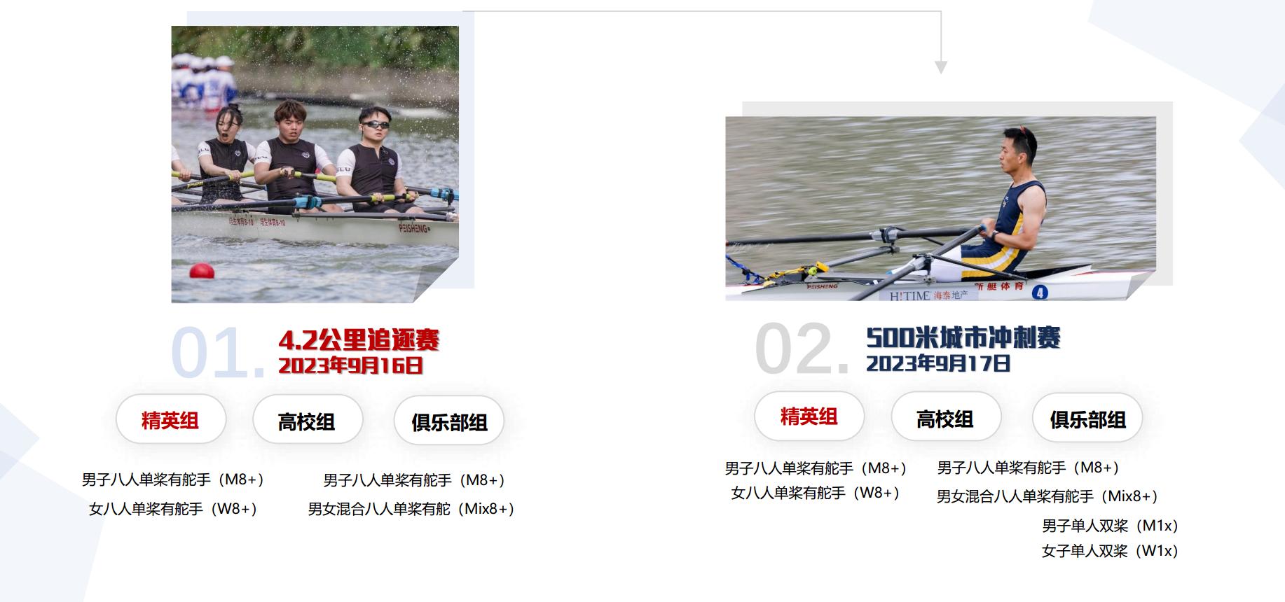 高校组与俱乐部组的男子八人单桨有舵手及男女混合八人单桨有舵手项目继续保留,八人艇4.2公里追逐赛、八人艇500米城市冲刺赛及俱乐部组别中的单人双桨男女500米城市冲刺赛等项目也继续保留。