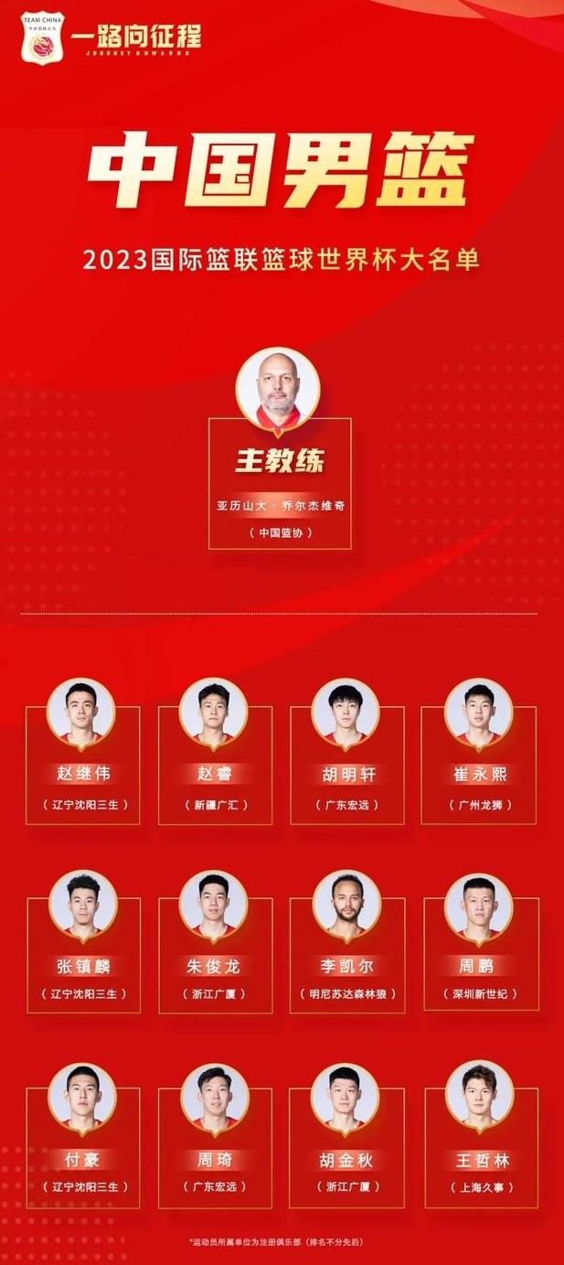8月22日晚,中国篮协公布了出战本届世界杯的中国队12人大名单,分别是:赵继伟、赵睿、胡明轩、崔永熙、张镇麟、朱俊龙、李凯尔、周鹏、付豪、周琦、胡金秋、王哲林。全队平均身高202.9厘米,平均年龄26.6岁。