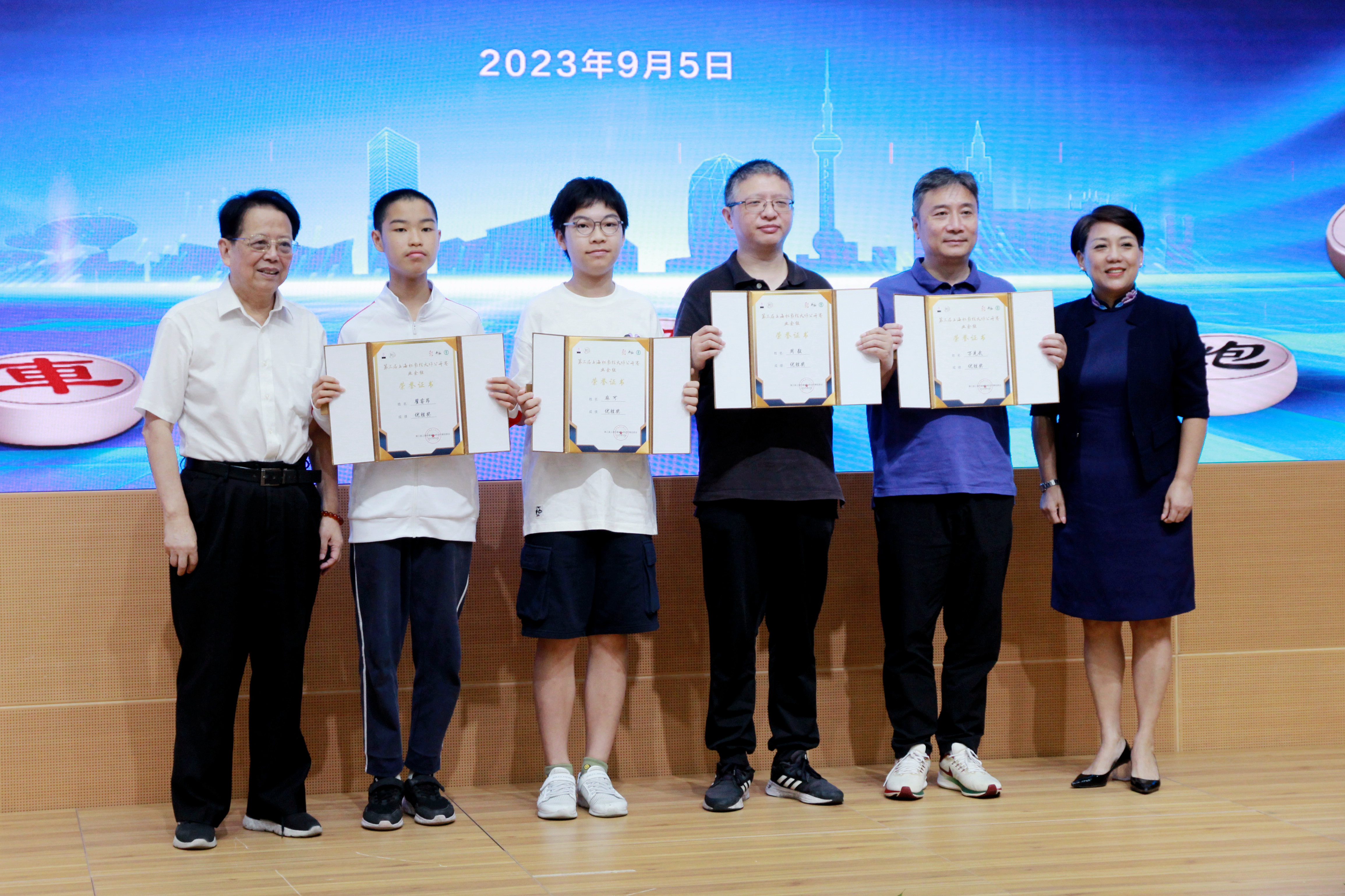 上海市体育局副局长宋慧和胡荣华特级大师为业余组优胜者代表颁奖。上海棋院供图