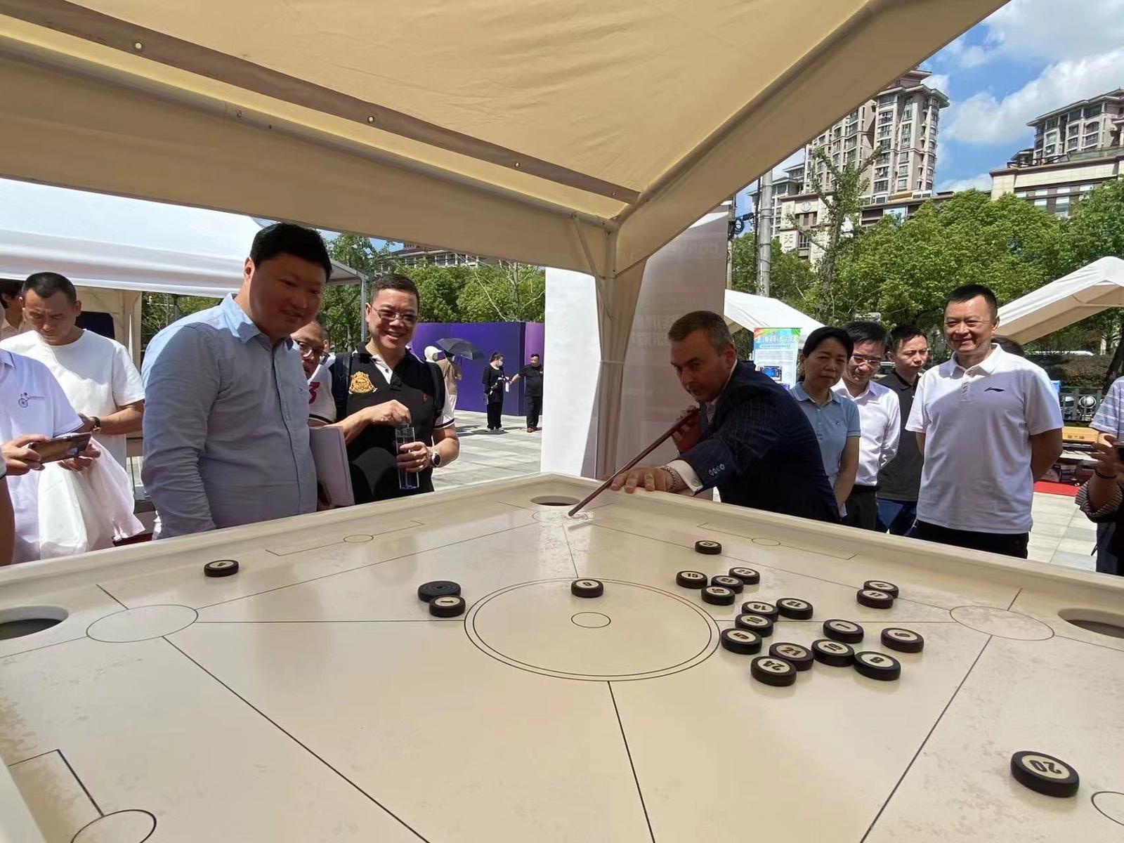 世界残疾人比利与斯诺克协会主席弗格森体验上海特有的康乐球。主办方供图