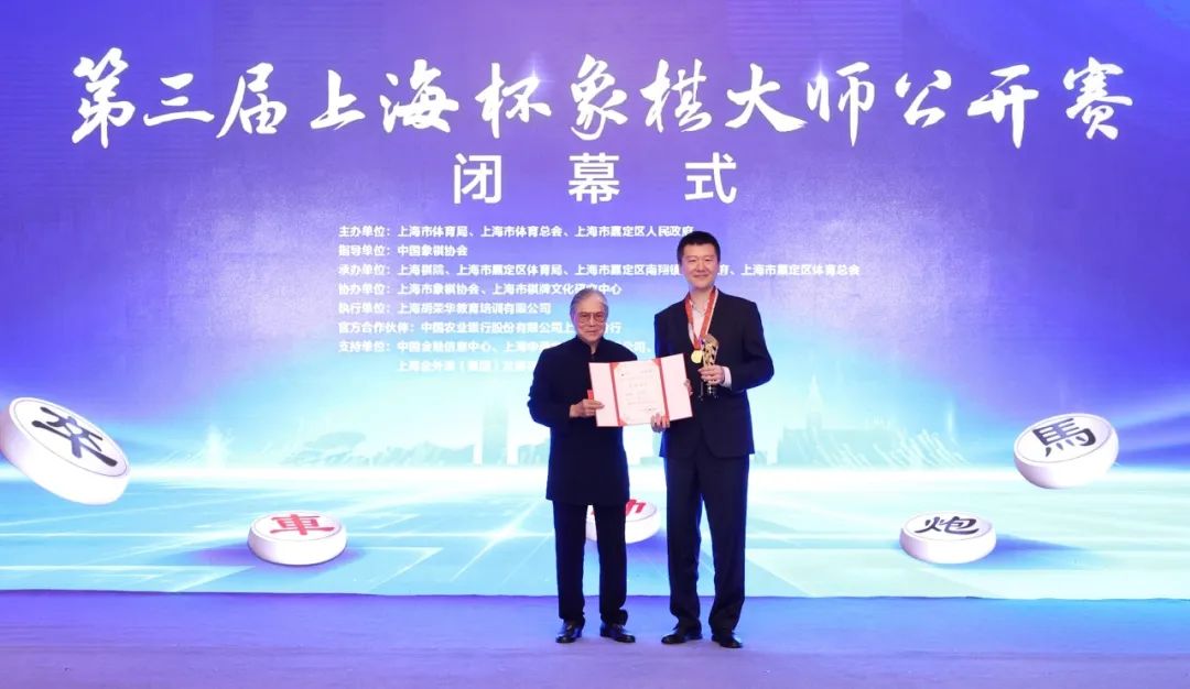 世界象棋联合会主席霍震霆为专业男子组冠军谢靖颁奖。主办方供图