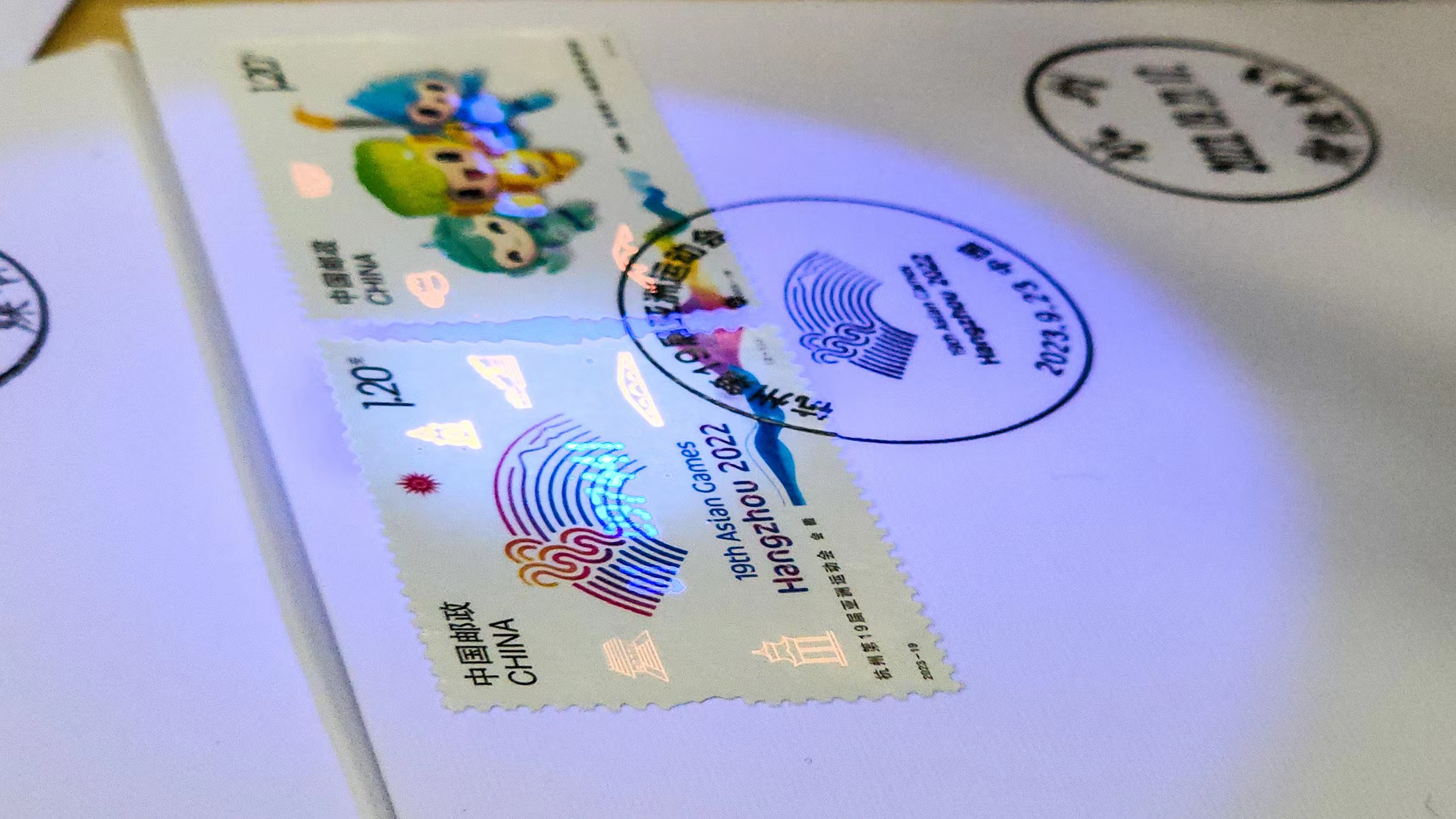 蓝光照射下,展示出独具杭州特色的防伪标志。