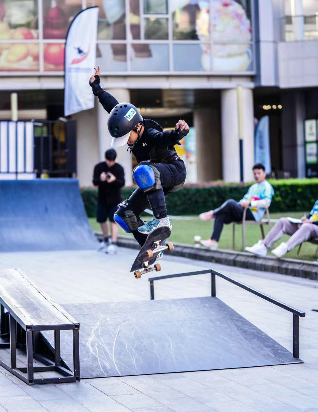 在小朋友比赛的同时,家长们纷纷举着手机拍摄记录,甚至会拖一块滑板,在空地上自己玩耍。比赛间隙和完赛之后,家长和小朋友还可以在商场走走逛逛。建滔地产华东地区销售总监郑文玮介绍,商场周边聚集了不少的企业和办公楼,工作日的午间时分,商场客流量很大,到了周末反而客流量会有所下降,“小朋友玩滑板,会带动好朋友和家长一起过来。未来,我们还会引入篮球、拳击、自行车等运动项目,想把建滔广场打造成上海最大的儿童运动培训基地,成为集运动、培训、零售、餐饮为一体的商办综合体。”