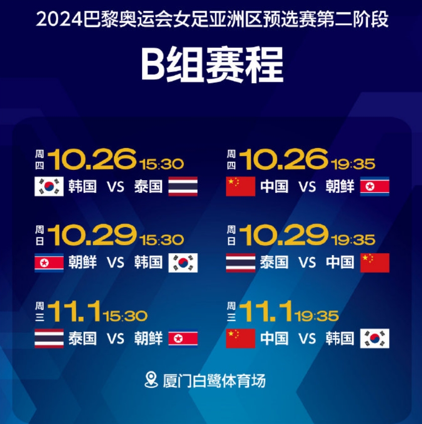 参加巴黎奥运会亚洲区预选赛的12支女足队伍被分为3个小组,各小组的第一名及成绩最好的小组第2名共4支队伍将跻身第三阶段的比赛,并争夺两张巴黎奥运会的入场券。10月26日,中国女足将在厦门迎来小组赛的首个对手朝鲜队。