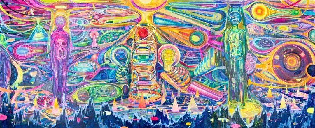 约十年后,黄宇兴的作品中,一个新的“荧光”系列“突然”出现。变异的风景、山川取代了夸张的身体、肖像,并一改过去的阴郁和沉闷,转向了一种流光溢彩、斑驳迷离的主题和风格。这看似是一次断裂,但实际上依然是黄宇兴关于自我的审视和表达:“穹宇之下,你我皆众生”。